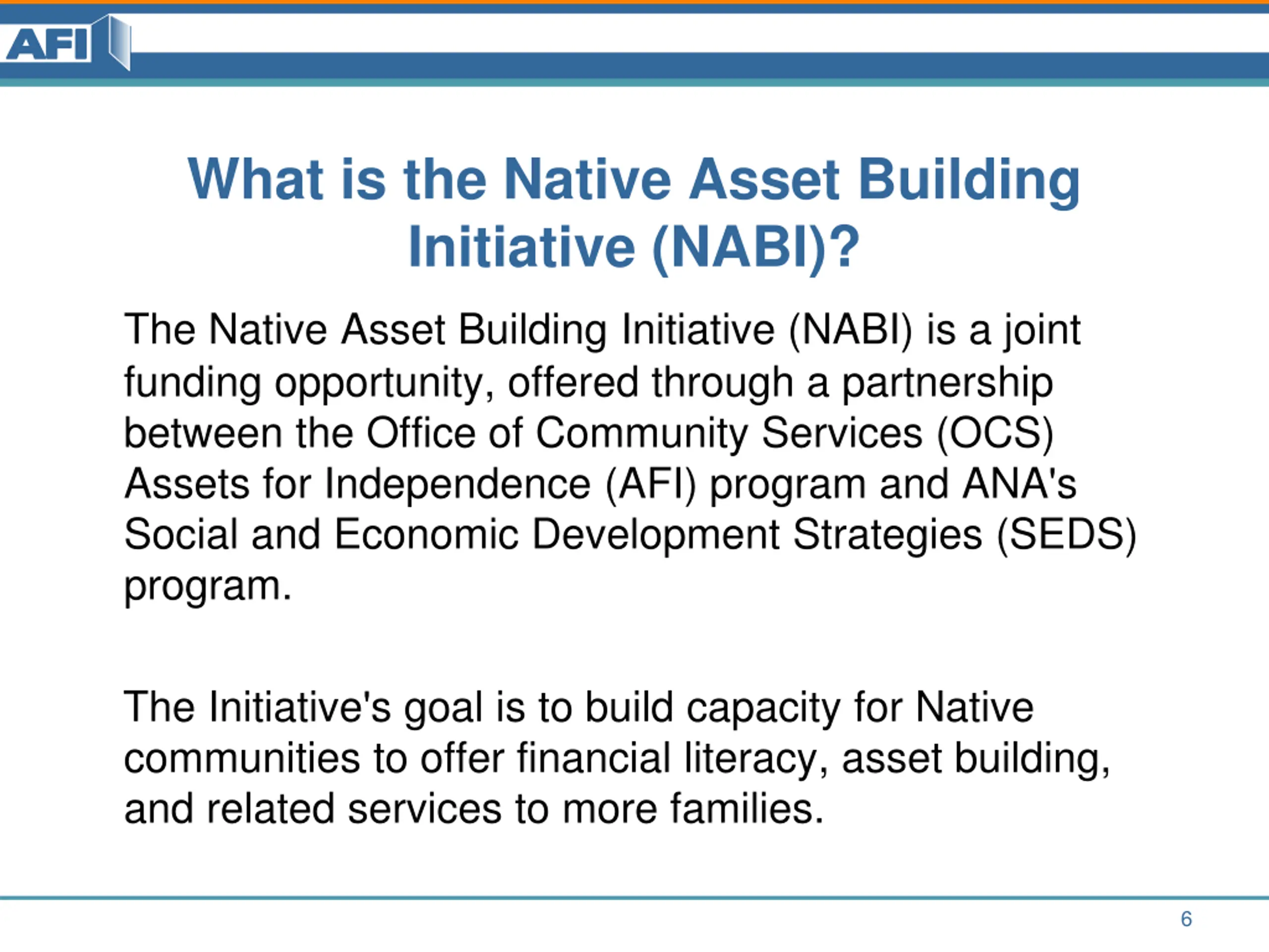 What is the Native Asset Building Initiative (NABI)? The Native Asset Building Initiative (NABI) is a joint funding opportunity, offered through a partnership between the Office of Community Services (OCS) Assets for Independence (AFI) program and ANA's Social and Economic Development Strategies (SEDS) program. The Initiative's goal is to build capacity for Native communities to offer financial literacy, asset building, and related services to more families. 6