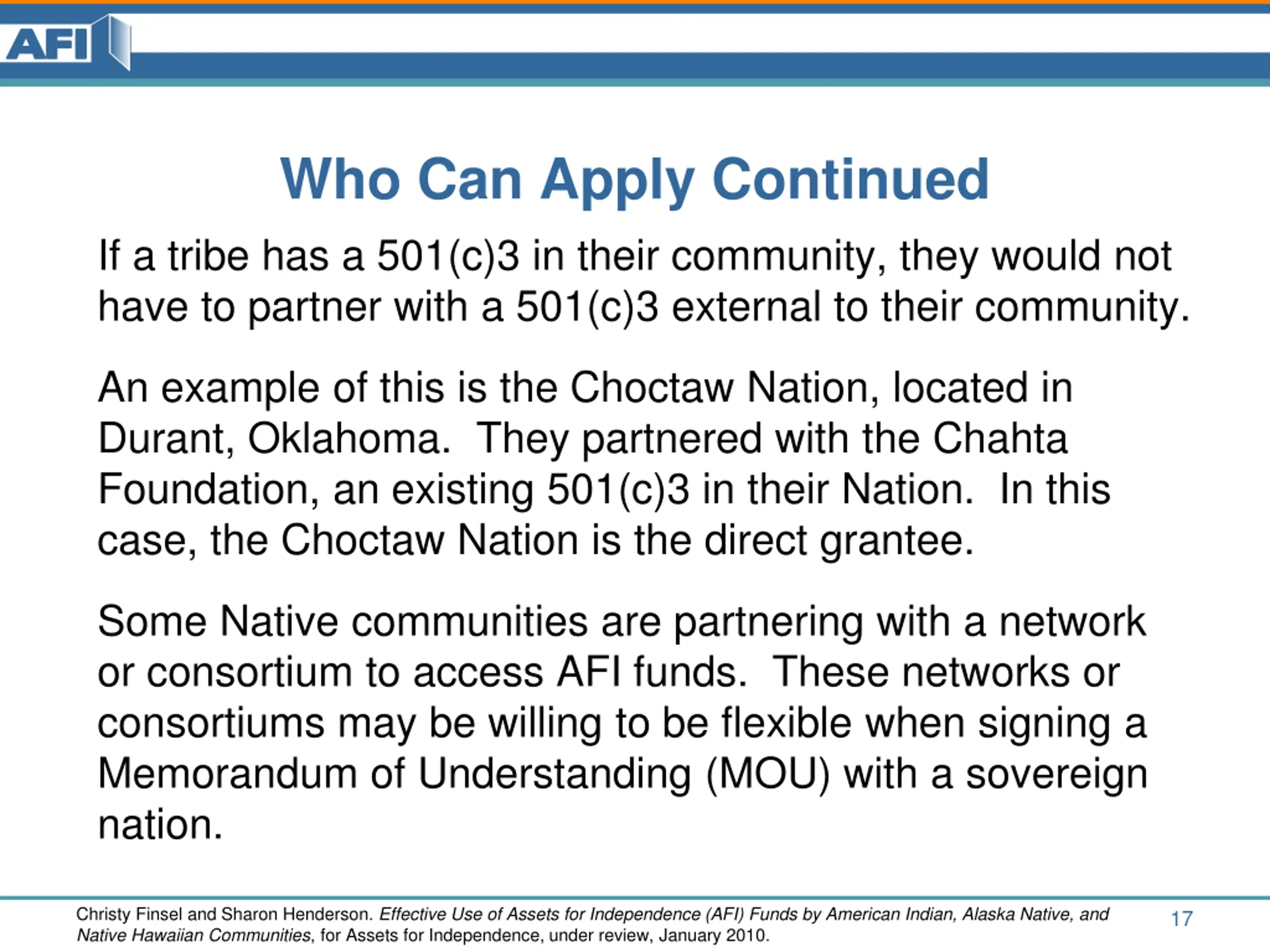 Who Can Apply Continued If a tribe has a 501(c)3 in their community, they would not have to partner with a 501(c)3 external to their community. An example of this is the Choctaw Nation, located in Durant, Oklahoma. They partnered with the Chahta Foundation, an existing 501(c)3 in their Nation. In this case, the Choctaw Nation is the direct grantee. Some Native communities are partnering with a network or consortium to access AFI funds. These networks or consortiums may be willing to be flexible when signing a Memorandum of Understanding (MOU) with a sovereign nation. Christy Finsel and Sharon Henderson. Effective Use of Assets for Independence (AFI) Funds by American Indian, Alaska Native, and Native Hawaiian Communities,for Assets for Independence, under review, January 2010. 17