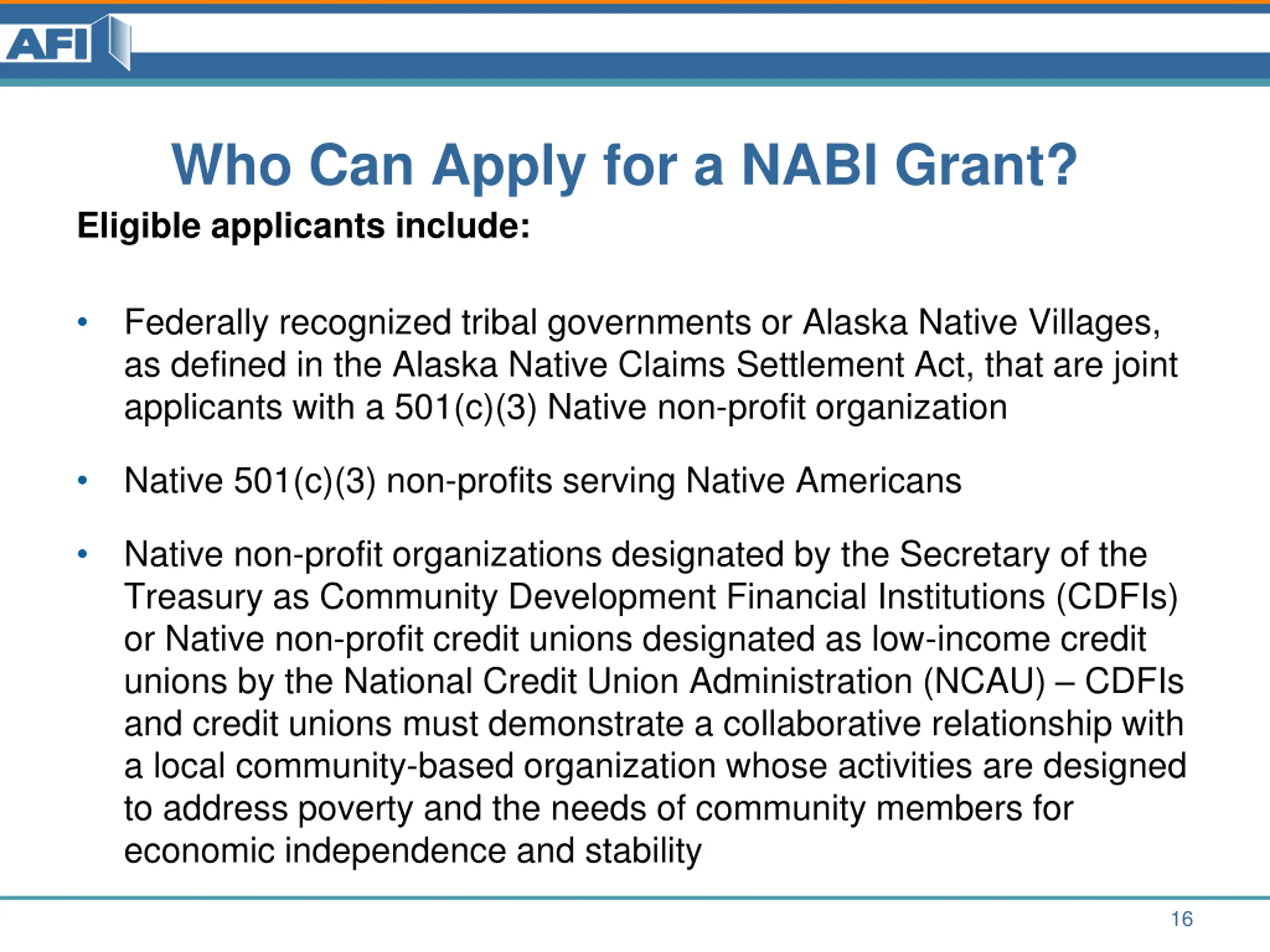 Who Can Apply for a NABI Grant? Eligible applicants include: Federally recognized tribal governments or Alaska Native Villages, as defined in the Alaska Native Claims Settlement Act, that are joint applicants with a 501(c)(3) Native non-profit organization Native 501(c)(3) non-profits serving Native Americans Native non-profit organizations designated by the Secretary of the Treasury as Community Development Financial Institutions (CDFIs) or Native non-profit credit unions designated as low-income credit unions by the National Credit Union Administration (NCAU) CDFIs and credit unions must demonstrate a collaborative relationship with a local community-based organization whose activities are designed to address poverty and the needs of community members for economic independence and stability 16
