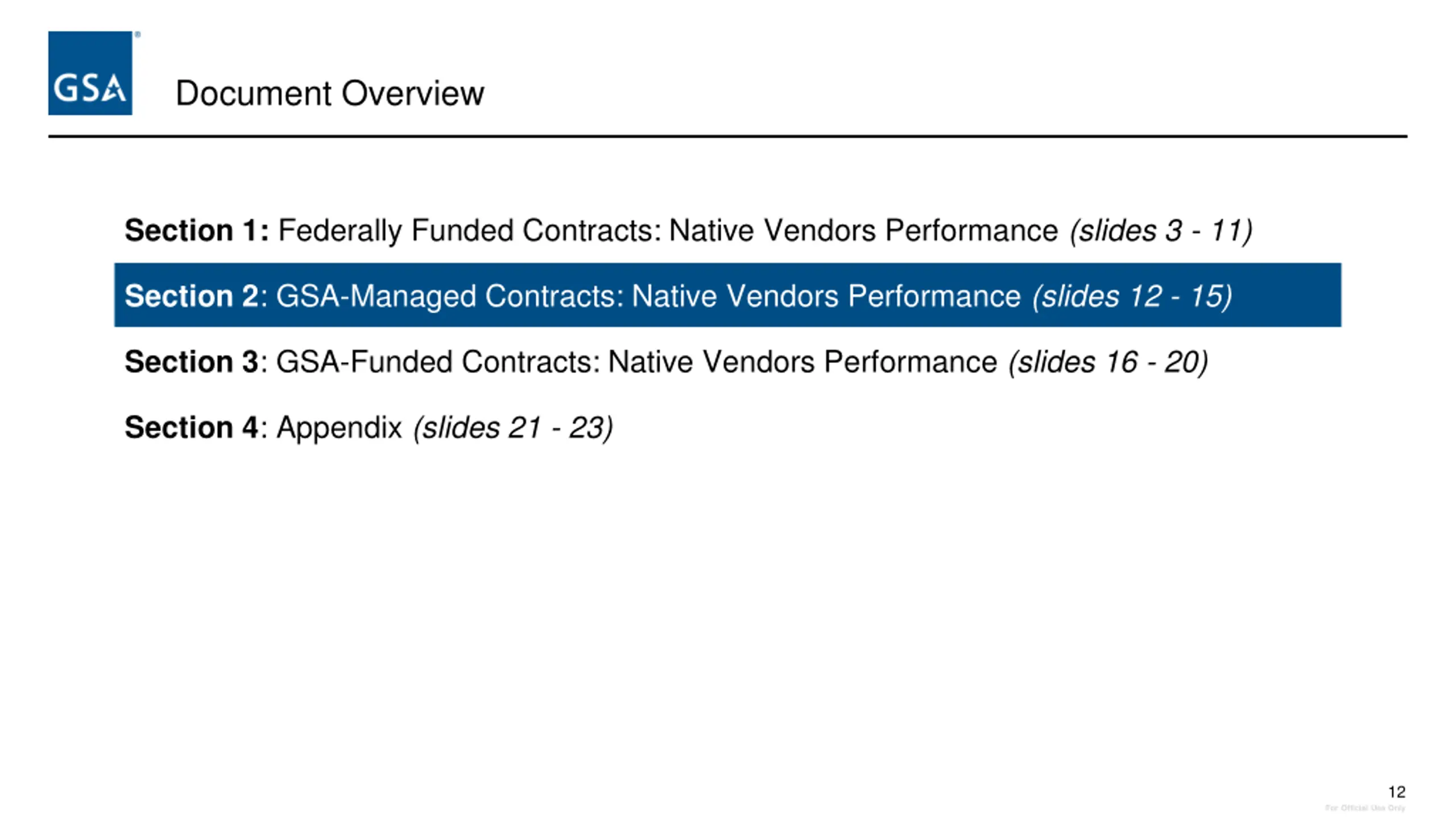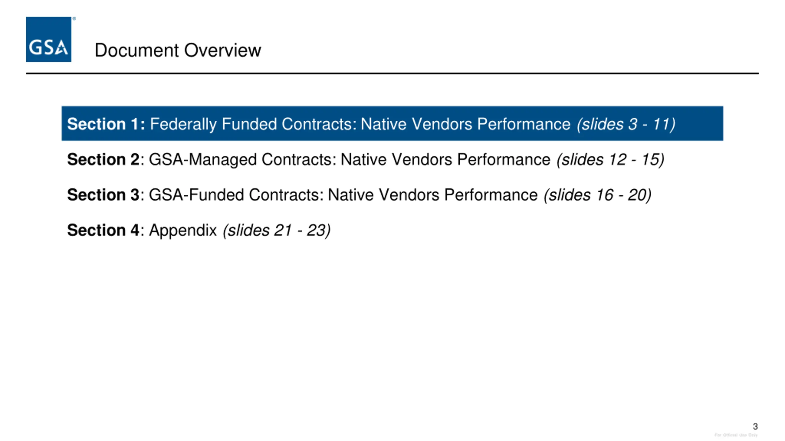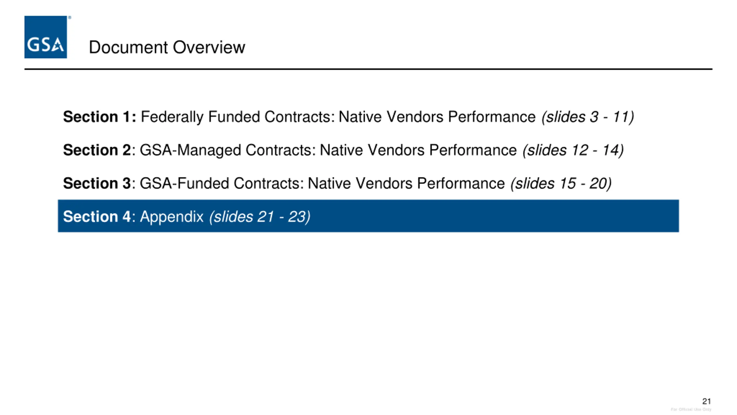 Document Overview Section 1: Federally Funded Contracts: Native Vendors Performance (slides 3 - 11) Section 2: GSA-Managed Contracts: Native Vendors Performance (slides 12 - 15) Section 3: GSA-Funded Contracts: Native Vendors Performance (slides 16 - 20) Section 4: Appendix (slides 21 - 23) 3 For Official Use Only