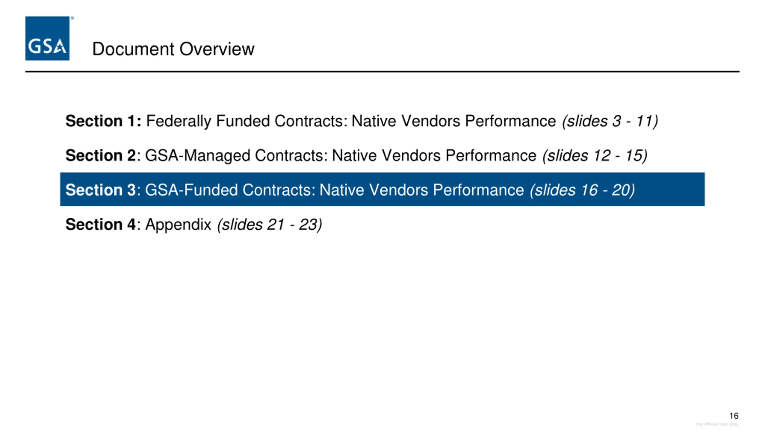 Document Overview Section 1: Federally Funded Contracts: Native Vendors Performance (slides 3 - 11) Section 2: GSA-Managed Contracts: Native Vendors Performance (slides 12 - 15) Section 3: GSA-Funded Contracts: Native Vendors Performance (slides 16 - 20) Section 4: Appendix (slides 21 - 23) 16 For Official Use Only