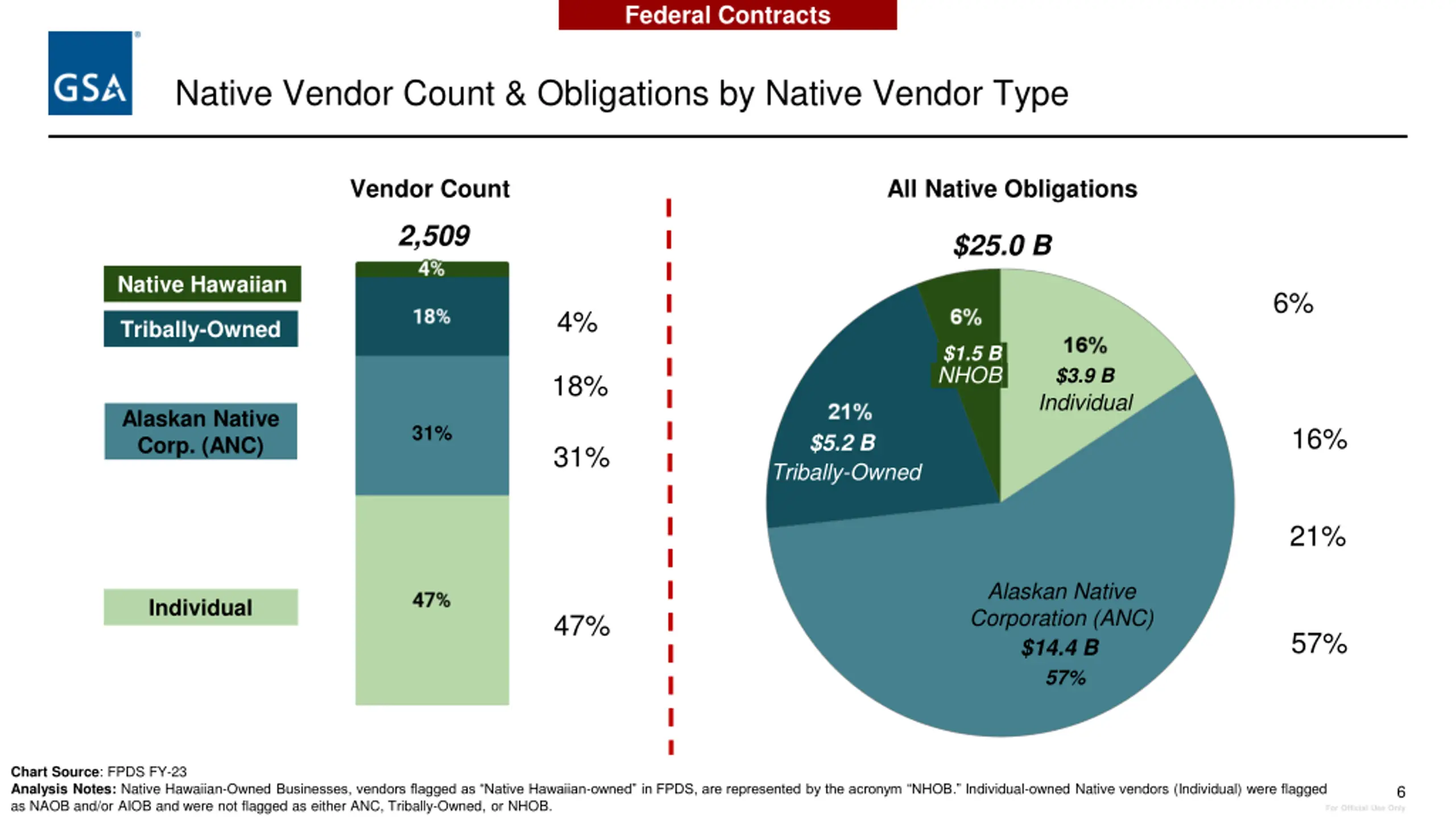Federal Contracts Native Obligations $656.0 B .4% . .$25.0 B. Native Non-Native 96% $631.0 B Chart Source: FPDS FY-23 Analysis Notes: Native vendors were vendors flagged in FPDS as either NAOB (Native American-Owned Business), Alaskan Native Corporation (ANC), AIOB (American Indian-Owned Business), Native Hawaiian -Owned Business (NHOB), and/or Tribally-Owned. 5 For Official Use Only