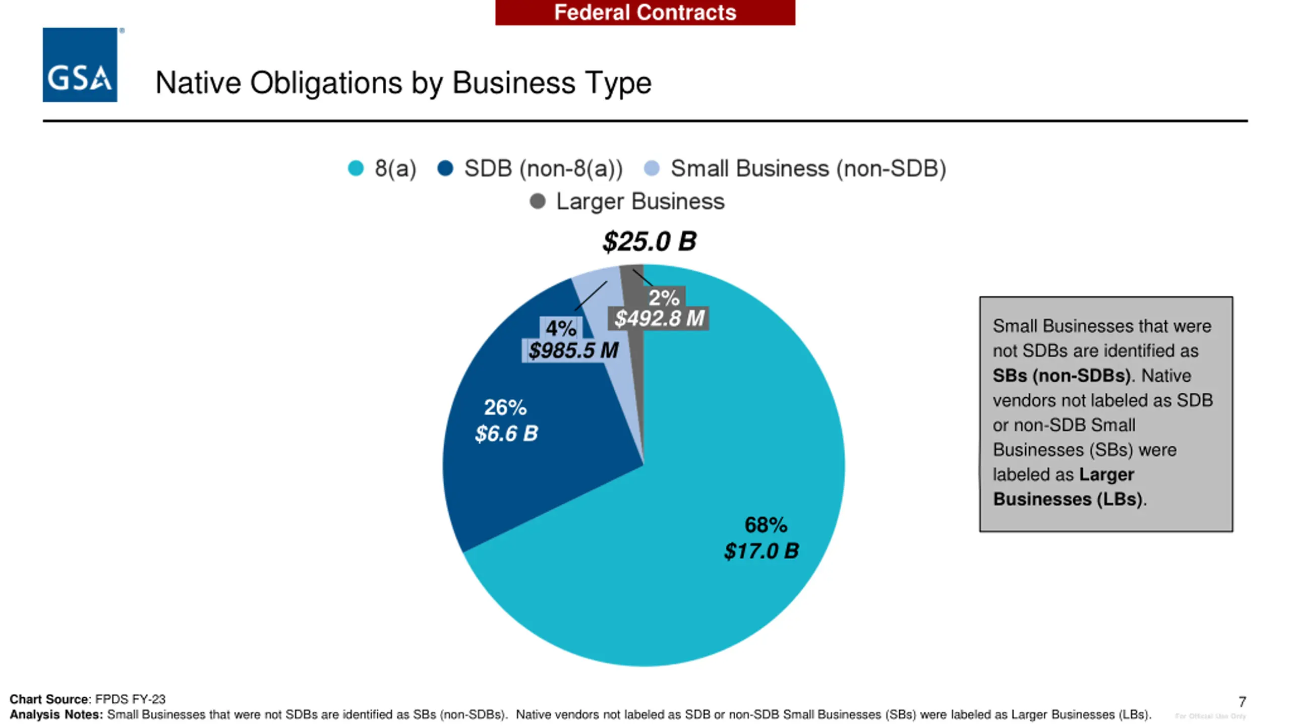 Federal Contracts Native Obligations by Business Type $25.0 B .2%. .$492.8 M. 8a Small Businesses that were not SDBs are identified as SBs (non-SDBs). Native vendors not labeled as SDB or non-SDB Small Businesses (SBs) were labeled as Larger Businesses (LBs). .4%. .$985.5 M. SDB (non-8a) 26% $6.6 B Small Business (non-sdb) Larger Business 68% $17.0 B Chart Source: FPDS FY-23 Analysis Notes: Small Businesses that were not SDBs are identified as SBs (non-SDBs). Native vendors not labeled as SDB or non-SDB Small Businesses (SBs) were labeled as Larger Businesses (LBs). 7 For Official Use Only