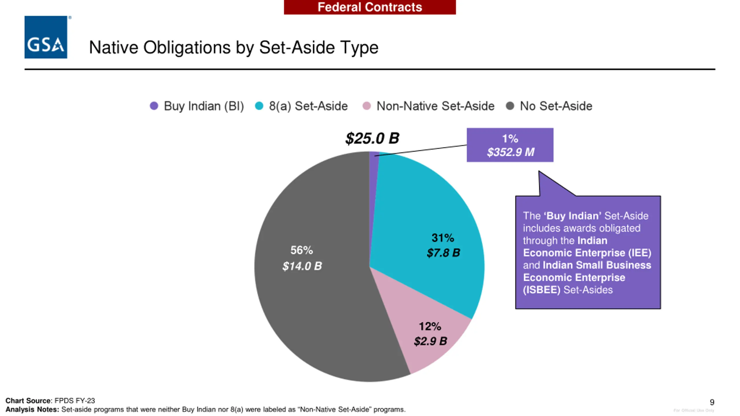 Federal Contracts Native Obligations by Contract Type $25.0 B Open market contracts are awarded to vendors without the use of a set-aside or government contract vehicle Other Contract Type includes: Indefinite Delivery Contracts (IDCs) Government-Wide Acquisition Contracts (GWACs) Blanket Purchase Agreements (BPAs) Basic Ordering Agreements (BOAs) Open Market 44% 52% $11.1 B $12.8 B Multiple Award Schedule .4%. .$867.6 M. Chart Source: FPDS FY-23 Analysis Notes: Other Contract Type includes Indefinite Delivery Contracts (IDCs), Government-Wide Acquisition Contracts (GWACs), Blanket Purchase Agreements (BPAs), and Basic Ordering Agreements (BAOs). Multiple Award Schedule obligations exclude the Veterans Affairs Schedule. 8 For Official Use Only