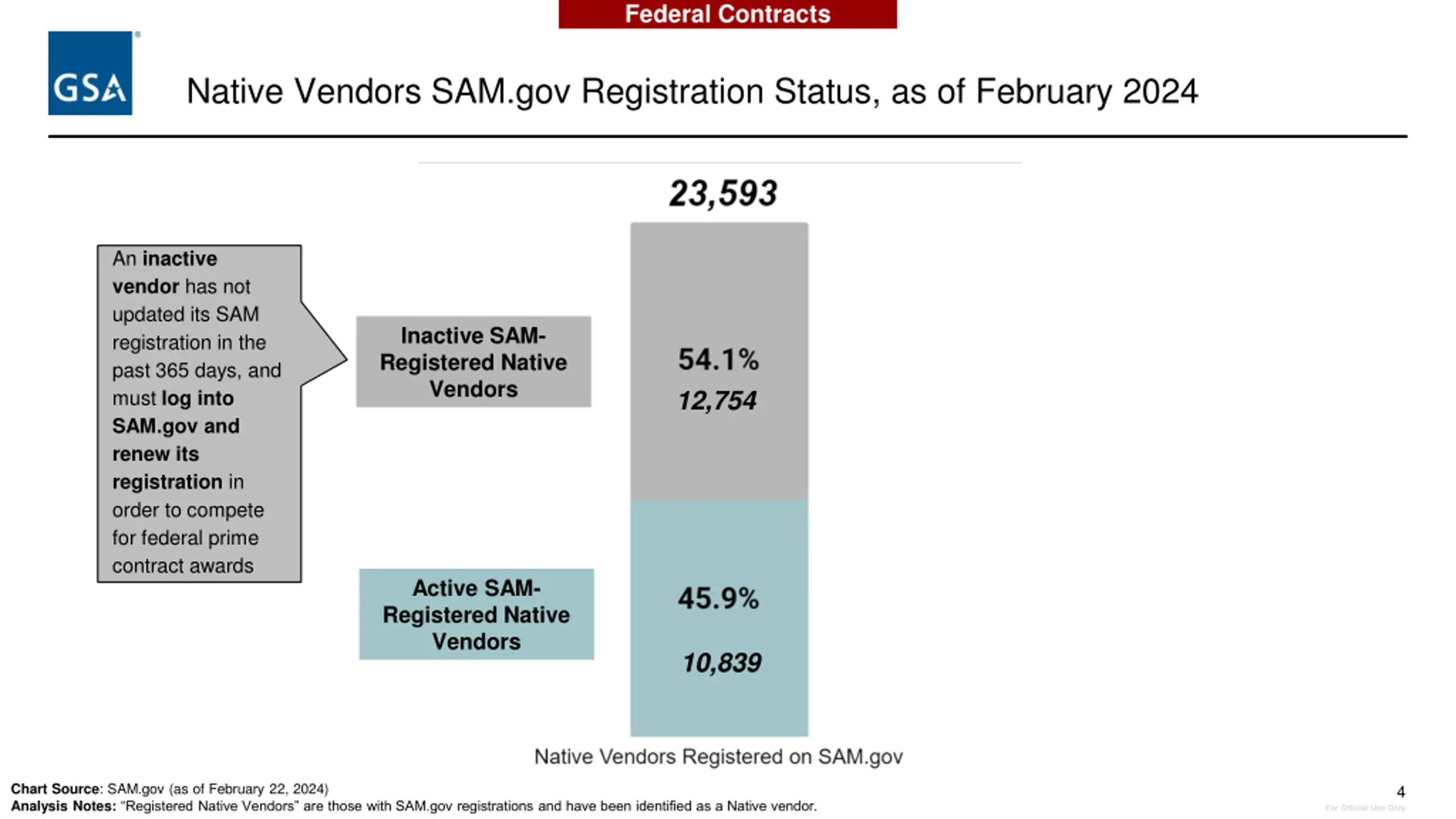 Federal Contracts Native Vendors SAM.gov Registration Status, as of February 2024 An inactive vendor has not updated its SAM registration in the past 365 days, and must log into SAM.gov and renew its registration in order to compete for federal prime contract awards Native Vendors Registered on SAM.gov: 23,593 Inactive SAM- Registered Native Vendors 12,754 45.9% 54.1% Active SAM- Registered Native Vendors 10,839 Chart Source: SAM.gov (as of February 22, 2024) Analysis Notes: Registered Native Vendors are those with SAM.gov registrations and have been identified as a Native vendor. 4 For Official Use Only