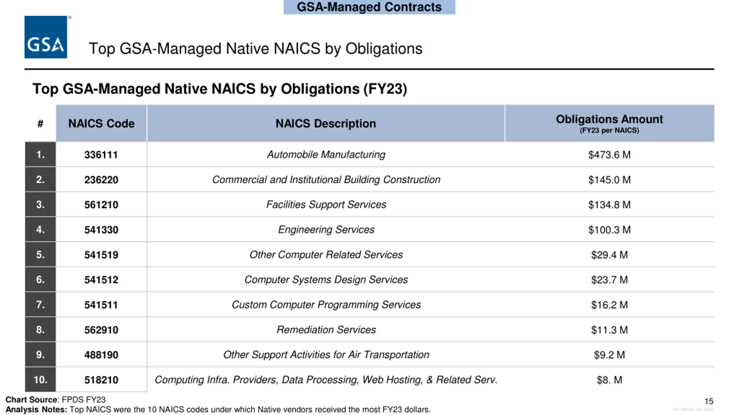 GSA-Managed Contracts Native Obligations by Contract Type $995.0 M Open market contracts are awarded to vendors without the use of a set-aside or government contract vehicle 15% Other Contract Type includes: Indefinite Delivery Contracts (IDCs) Government-Wide Acquisition Contracts (GWACs) Blanket Purchase Agreements (BPAs) Basic Ordering Agreements (BOAs) $147.6 M Open Market 12% $120.2 M Multiple Award Schedule 73% Other Contract Types $727.3 M Chart Source: FPDS FY-23 Analysis Notes: GSA-Managed obligations were identified by Contracting Department. Other Contract Type includes Indefinite Delivery Contracts (IDCs), Government-Wide Acquisition Contracts (GWACs), Blanket Purchase Agreements (BPAs), and Basic Ordering Agreements (BAOs). Multiple Award Schedule obligations exclude the Veterans Affairs Schedule. 14 For Official Use Only