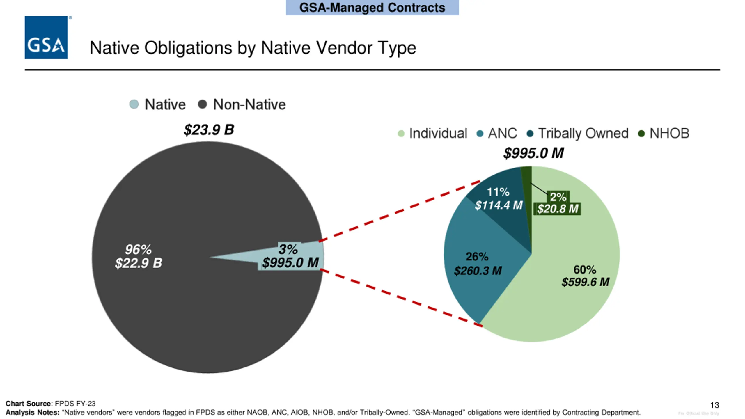 Document Overview Section 1: Federally Funded Contracts: Native Vendors Performance (slides 3 - 11) Section 2: GSA-Managed Contracts: Native Vendors Performance (slides 12 - 15) Section 3: GSA-Funded Contracts: Native Vendors Performance (slides 16 - 20) Section 4: Appendix (slides 21 - 23) 12 For Official Use Only