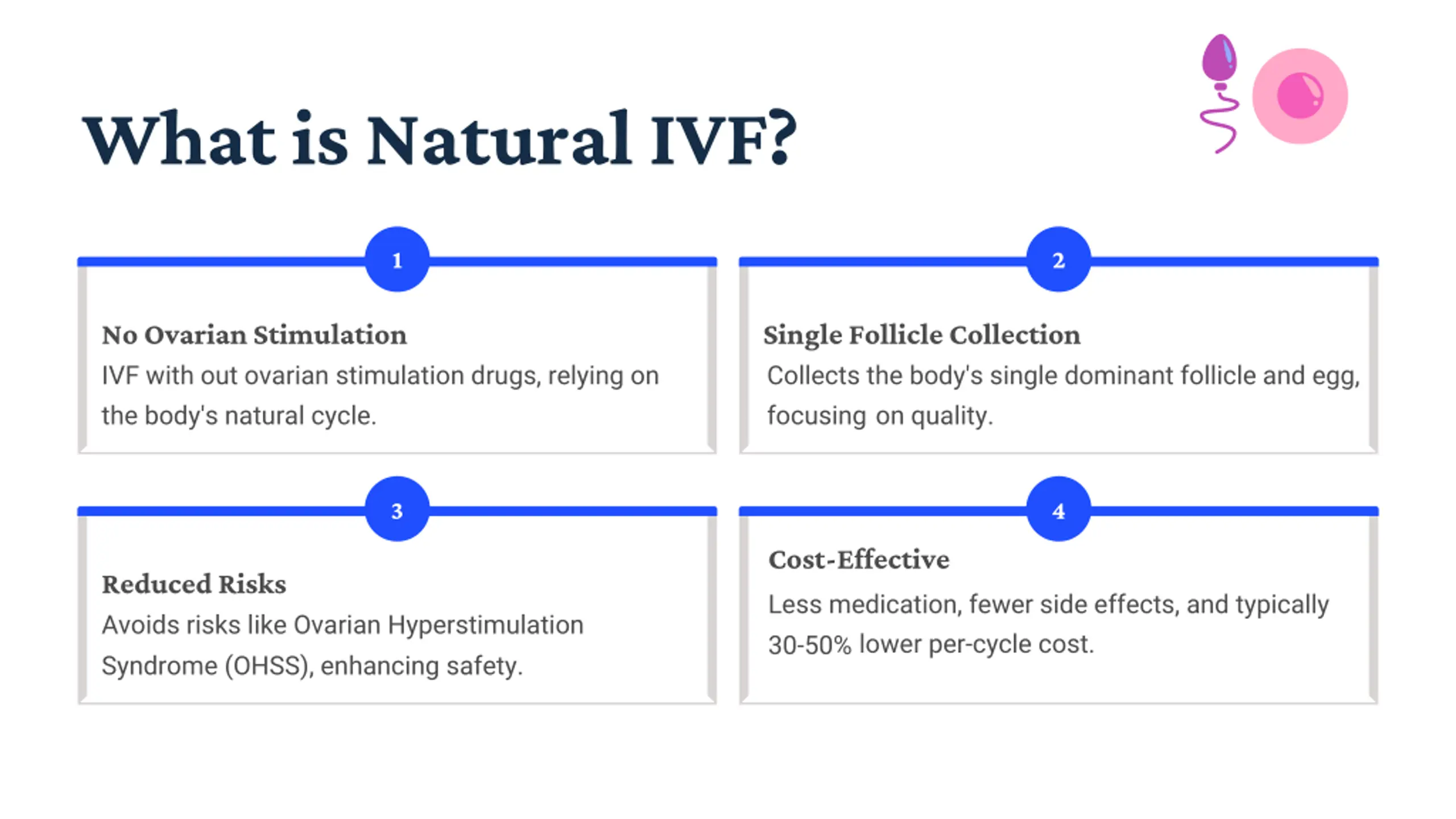 What is Natural IVF? 2 1 No Ovarian Stimulation IVF with out ovarian stimulation drugs, relying on the body's natural cycle. Single Follicle Collection Collects the body's single dominant follicle and egg, focusing on quality. 3 4 Cost-Effective Less medication, fewer side effects, and typically 30-50% Reduced Risks Avoids risks like Ovarian Hyperstimulation Syndrome (OHSS), enhancing safety. lower per-cycle cost.