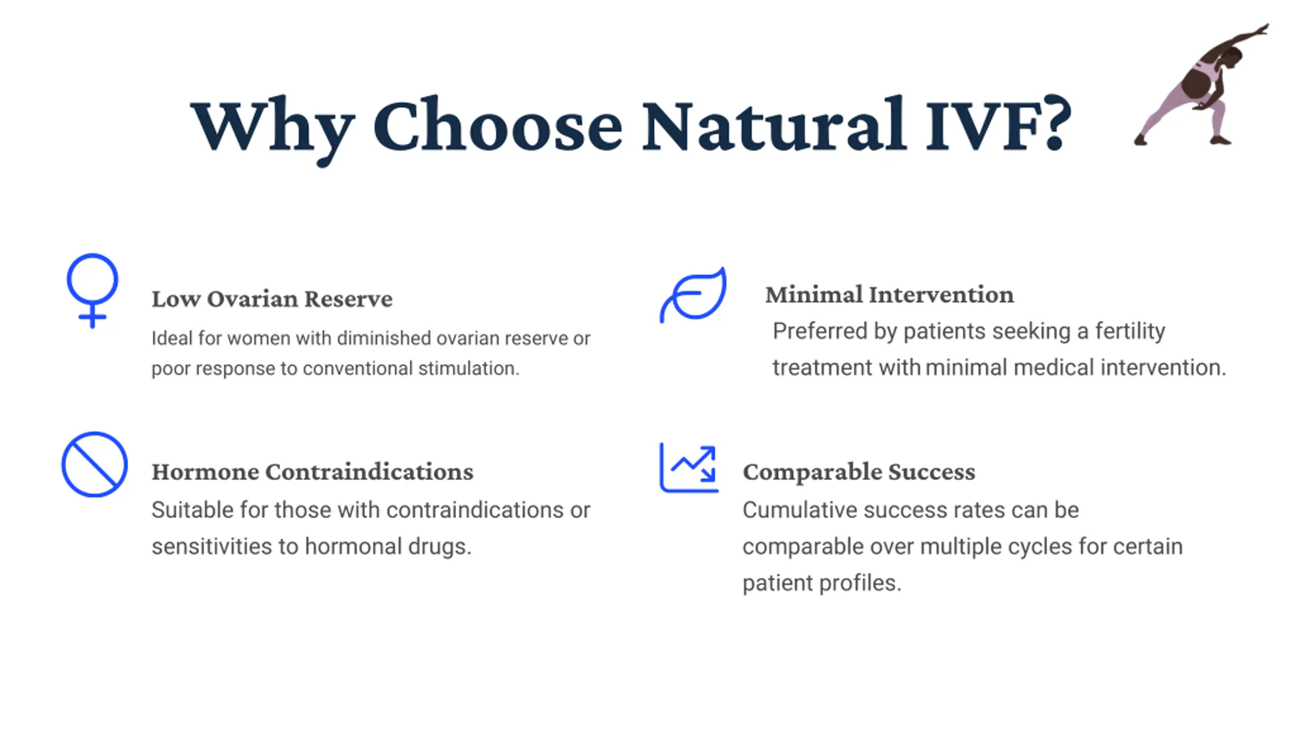 Why Choose Natural IVF? Minimal Intervention Preferred by patients seeking a fertility treatment withminimal medical intervention. LowOvarianReserve Ideal for women with diminished ovarian reserve or poor response to conventional stimulation. Hormone Contraindications Suitable for those with contraindications or sensitivities to hormonal drugs. Comparable Success Cumulative success rates can be comparable over multiple cycles for certain patient profiles.