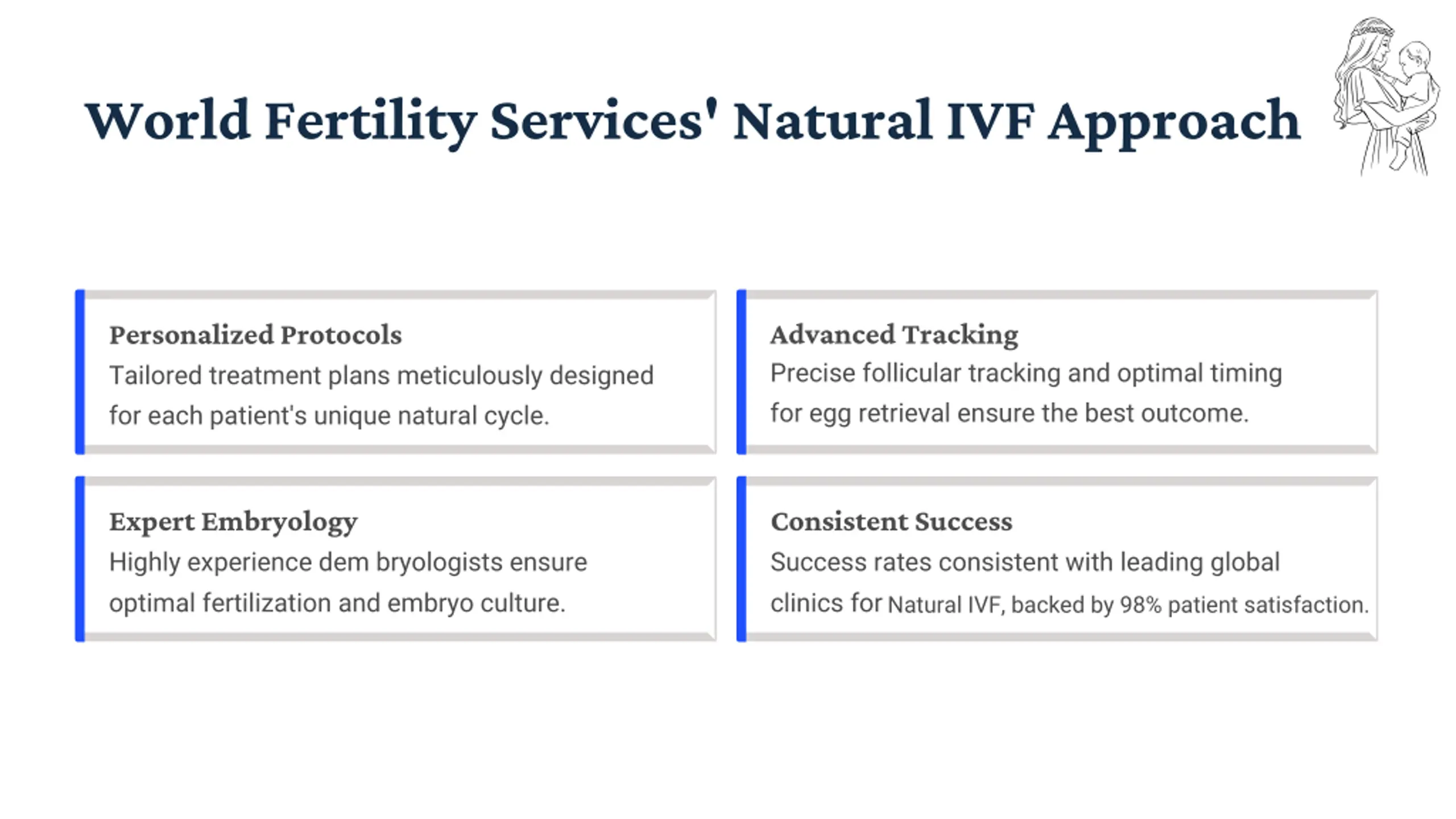 World Fertility Services' Natural IVF Approach AdvancedTracking Precise follicular tracking and optimal timing for egg retrieval ensure the best outcome. PersonalizedProtocols Tailored treatment plans meticulously designed for each patient's unique natural cycle. Expert Embryology Highly experience dem bryologists ensure optimal fertilization and embryo culture. Consistent Success Success rates consistent with leading global clinics for Natural IVF, backed by 98% patient satisfaction.