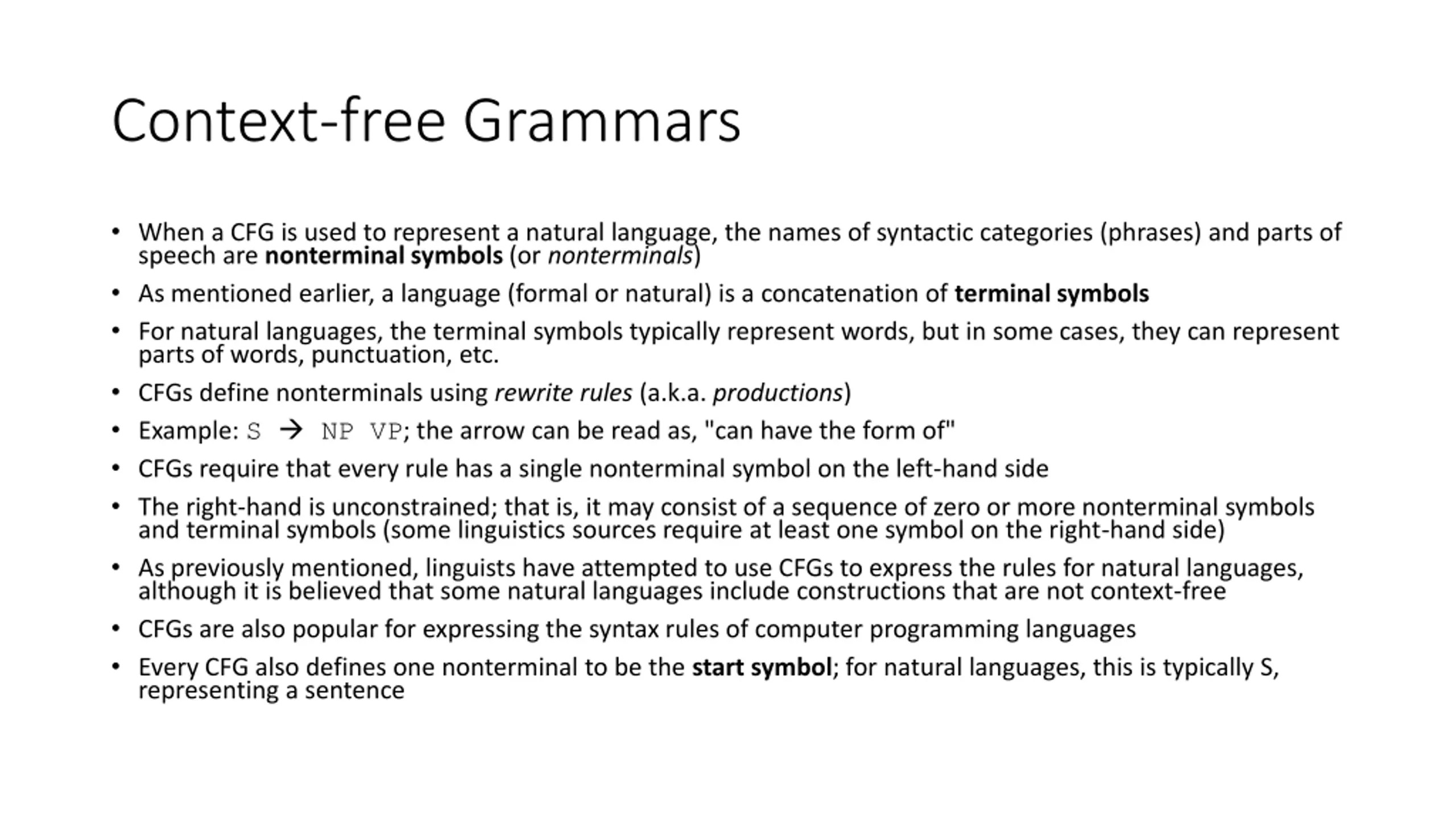 Context-free Grammars When a CFG is used to represent a natural language, the names of syntactic categories (phrases) and parts of speech are nonterminal symbols (or nonterminals) As mentioned earlier, a language (formal or natural) is a concatenation of terminal symbols For natural languages, the terminal symbols typically represent words, but in some cases, they can represent parts of words, punctuation, etc. CFGs define nonterminals using rewrite rules (a.k.a. productions) Example: S NP VP; the arrow can be read as, "can have the form of" CFGs require that every rule has a single nonterminal symbol on the left-hand side The right-hand is unconstrained; that is, it may consist of a sequence of zero or more nonterminal symbols and terminal symbols (some linguistics sources require at least one symbol on the right-hand side) As previously mentioned, linguists have attempted to use CFGs to express the rules for natural languages, although it is believed that some natural languages include constructions that are not context-free CFGs are also popular for expressing the syntax rules of computer programming languages Every CFG also defines one nonterminal to be the start symbol; for natural languages, this is typically S, representing a sentence