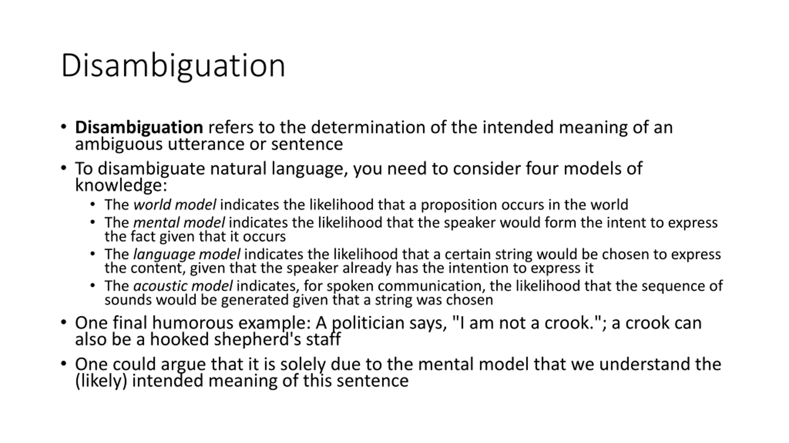 Disambiguation Disambiguation refers to the determination of the intended meaning of an ambiguous utterance or sentence To disambiguate natural language, you need to consider four models of knowledge: The world model indicates the likelihood that a proposition occurs in the world The mental model indicates the likelihood that the speaker would form the intent to express the fact given that it occurs The language model indicates the likelihood that a certain string would be chosen to express the content, given that the speaker already has the intention to express it The acoustic model indicates, for spoken communication, the likelihood that the sequence of sounds would be generated given that a string was chosen One final humorous example: A politician says, "I am not a crook."; a crook can also be a hooked shepherd's staff One could argue that it is solely due to the mental model that we understand the (likely) intended meaning of this sentence