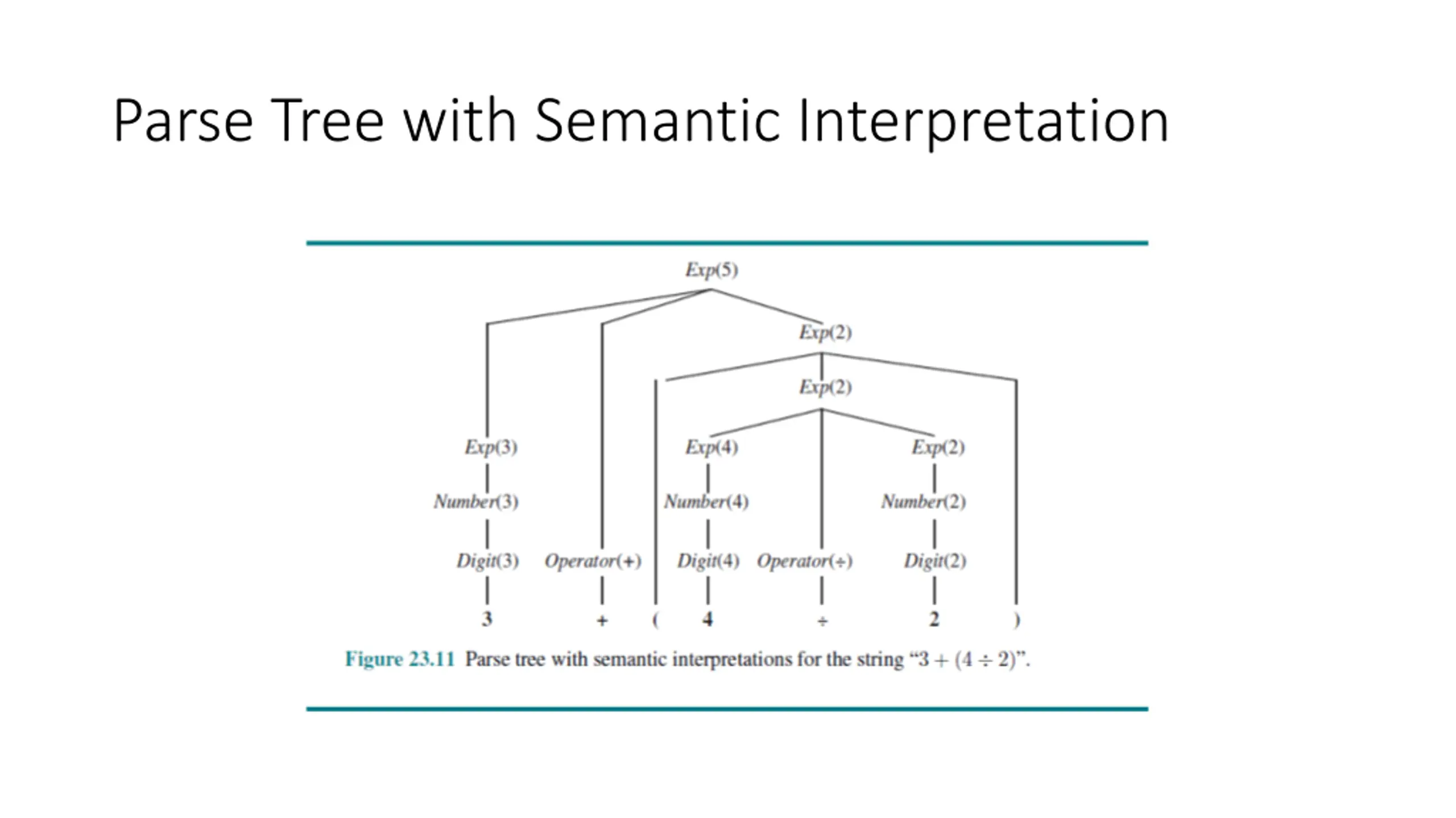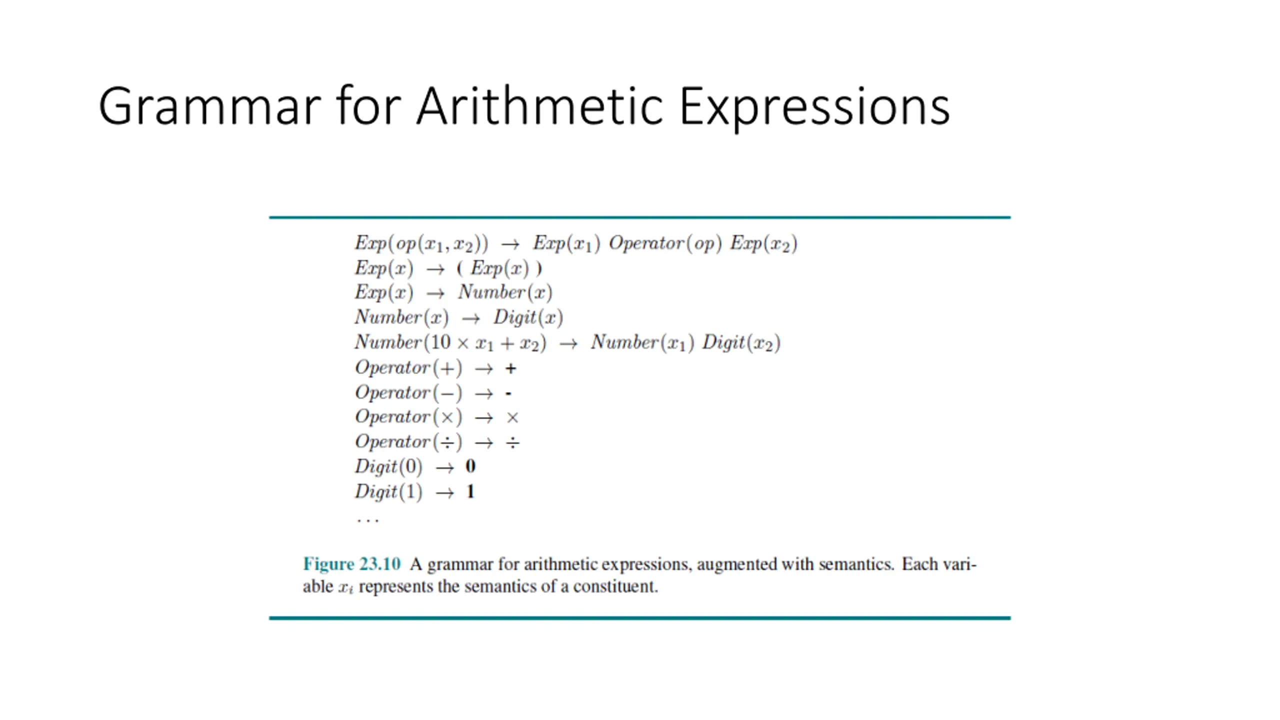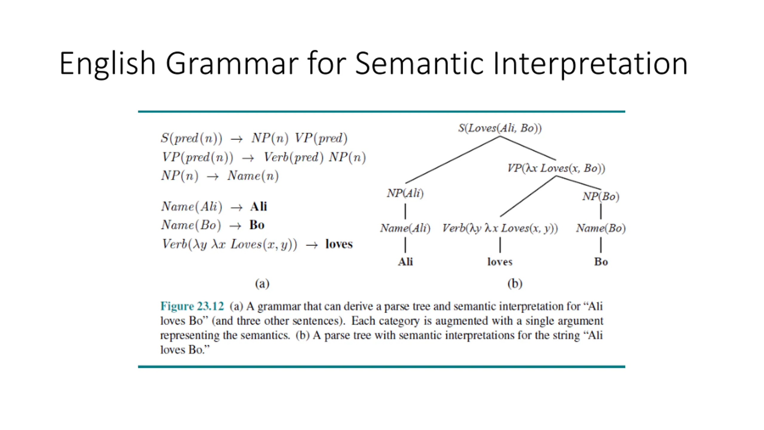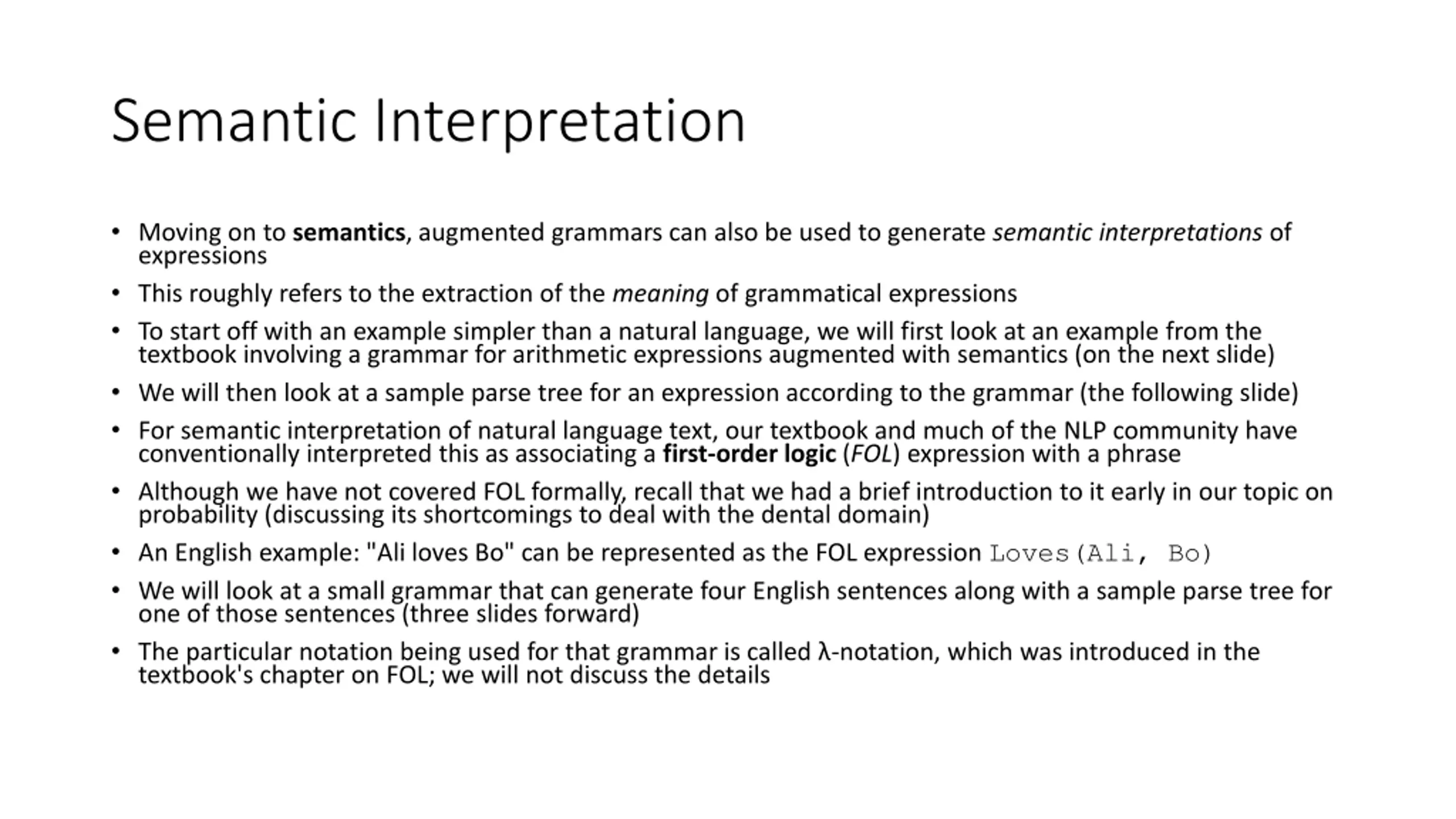 Semantic Interpretation Moving on to semantics, augmented grammars can also be used to generate semantic interpretations of expressions This roughly refers to the extraction of the meaning of grammatical expressions To start off with an example simpler than a natural language, we will first look at an example from the textbook involving a grammar for arithmetic expressions augmented with semantics (on the next slide) We will then look at a sample parse tree for an expression according to the grammar (the following slide) For semantic interpretation of natural language text, our textbook and much of the NLP community have conventionally interpreted this as associating a first-order logic (FOL) expression with a phrase Although we have not covered FOL formally, recall that we had a brief introduction to it early in our topic on probability (discussing its shortcomings to deal with the dental domain) An English example: "Ali loves Bo" can be represented as the FOL expression Loves(Ali, Bo) We will look at a small grammar that can generate four English sentences along with a sample parse tree for one of those sentences (three slides forward) The particular notation being used for that grammar is called -notation, which was introduced in the textbook's chapter on FOL; we will not discuss the details