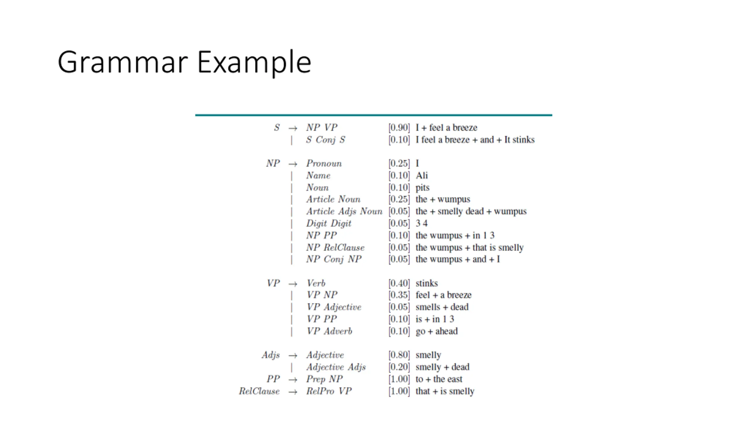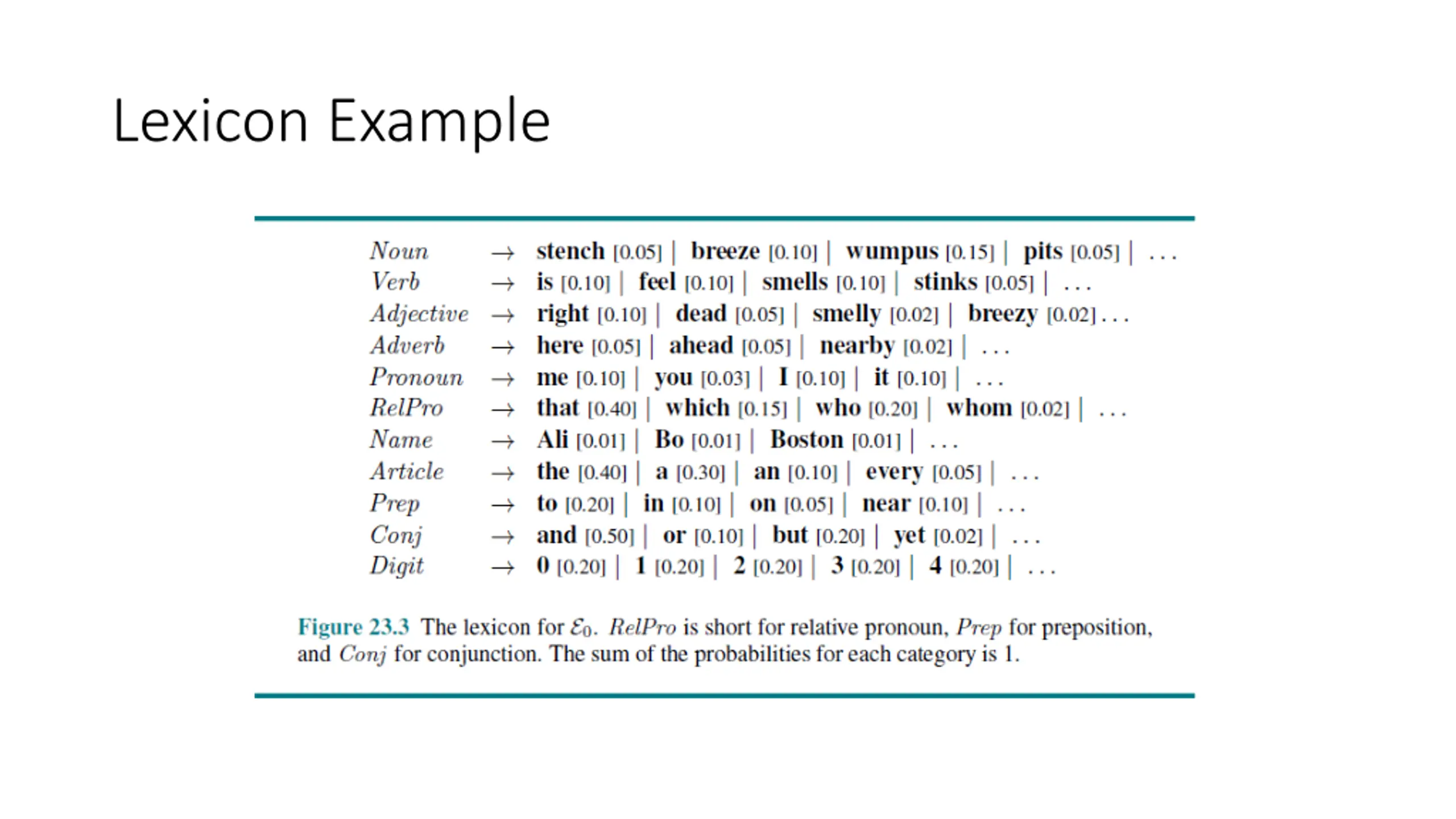 Probabilistic Context Free Grammars The formalism we will use to express grammars including lexicons is actually an extension of a CFG called a probabilistic context-free grammar (PCFG) Every rule will include an associated number, indicating the frequency of the right-hand side given the left- hand side Recall that the left-hand side is always a single nonterminal, typically representing a type of phrase or a POS It is typical to consider these frequencies to be probabilities, representing the likelihood that a phrase or POS is formed a certain way The probabilities of all the valid right-hand sides for any nonterminal will sum to 1 In practice, the probabilities of a PCFG would be learned based on a training set, generally from a treebank Example: S NP VP [0.90] As with a regular CFG, this rule tells us that a sentence can have the form of a noun phrase followed by a verb phrase In a PCFG, the rule additionally tells us that 90% of sentences have this form The next two slides show examples of a lexicon and grammar that might be appropriate to allow sentences related to the wumpus world The vertical bars in these examples can be read as "or"; this provides a shorthand for representing multiple rules in one line