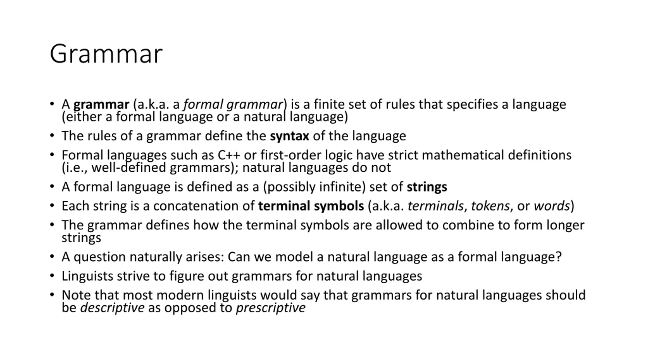 Grammar A grammar (a.k.a. a formal grammar) is a finite set of rules that specifies a language (either a formal language or a natural language) The rules of a grammar define the syntax of the language Formal languages such as C++ or first-order logic have strict mathematical definitions (i.e., well-defined grammars); natural languages do not A formal language is defined as a (possibly infinite) set of strings Each string is a concatenation of terminal symbols (a.k.a. terminals, tokens, or words) The grammar defines how the terminal symbols are allowed to combine to form longer strings A question naturally arises: Can we model a natural language as a formal language? Linguists strive to figure out grammars for natural languages Note that most modern linguists would say that grammars for natural languages should be descriptive as opposed to prescriptive