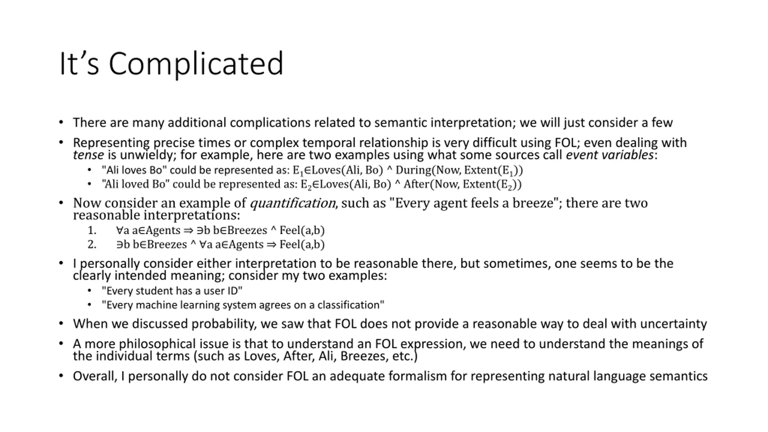 Its Complicated There are many additional complications related to semantic interpretation; we will just consider a few Representing precise times or complex temporal relationship is very difficult using FOL; even dealing with tense is unwieldy; for example, here are two examples using what some sources call event variables: "Ali loves Bo" could be represented as: E1 Loves(Ali, Bo) ^ During(Now, Extent(E1)) "Ali loved Bo" could be represented as: E2 Loves(Ali, Bo) ^ After(Now, Extent(E2)) Now consider an example of quantification, such as "Every agent feels a breeze"; there are two reasonable interpretations: 1. a a Agents b b Breezes ^ Feel(a,b) 2. b b Breezes ^ a a Agents Feel(a,b) I personally consider either interpretation to be reasonable there, but sometimes, one seems to be the clearly intended meaning; consider my two examples: "Every student has a user ID" "Every machine learning system agrees on a classification" When we discussed probability, we saw that FOL does not provide a reasonable way to deal with uncertainty A more philosophical issue is that to understand an FOL expression, we need to understand the meanings of the individual terms (such as Loves, After, Ali, Breezes, etc.) Overall, I personally do not consider FOL an adequate formalism for representing natural language semantics