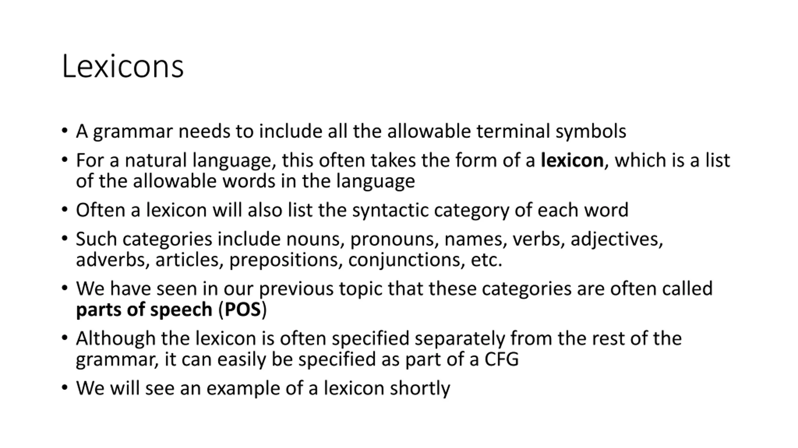 Lexicons A grammar needs to include all the allowable terminal symbols For a natural language, this often takes the form of a lexicon, which is a list of the allowable words in the language Often a lexicon will also list the syntactic category of each word Such categories include nouns, pronouns, names, verbs, adjectives, adverbs, articles, prepositions, conjunctions, etc. We have seen in our previous topic that these categories are often called parts of speech (POS) Although the lexicon is often specified separately from the rest of the grammar, it can easily be specified as part of a CFG We will see an example of a lexicon shortly