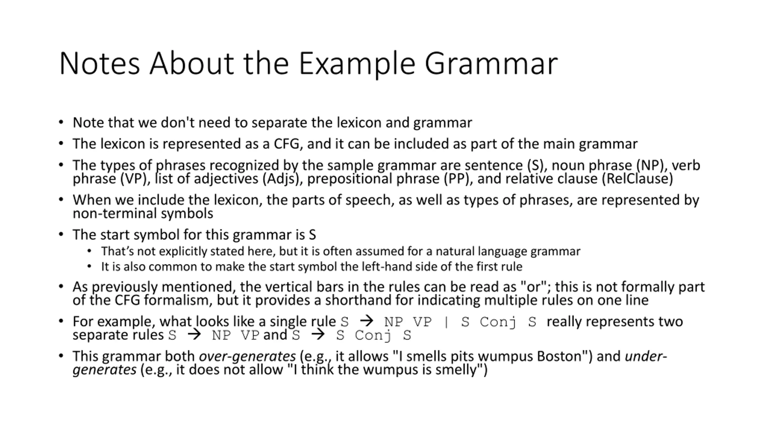 Notes About the Example Grammar Note that we don't need to separate the lexicon and grammar The lexicon is represented as a CFG, and it can be included as part of the main grammar The types of phrases recognized by the sample grammar are sentence (S), noun phrase (NP), verb phrase (VP), list of adjectives (Adjs), prepositional phrase (PP), and relative clause (RelClause) When we include the lexicon, the parts of speech, as well as types of phrases, are represented by non-terminal symbols The start symbol for this grammar is S That s not explicitly stated here, but it is often assumed for a natural language grammar It is also common to make the start symbol the left-hand side of the first rule As previously mentioned, the vertical bars in the rules can be read as "or"; this is not formally part of the CFG formalism, but it provides a shorthand for indicating multiple rules on one line For example, what looks like a single rule S NP VP | S Conj S really represents two separate rules S NP VP and S S Conj S This grammar both over-generates (e.g., it allows "I smells pits wumpus Boston") and under- generates (e.g., it does not allow "I think the wumpus is smelly")