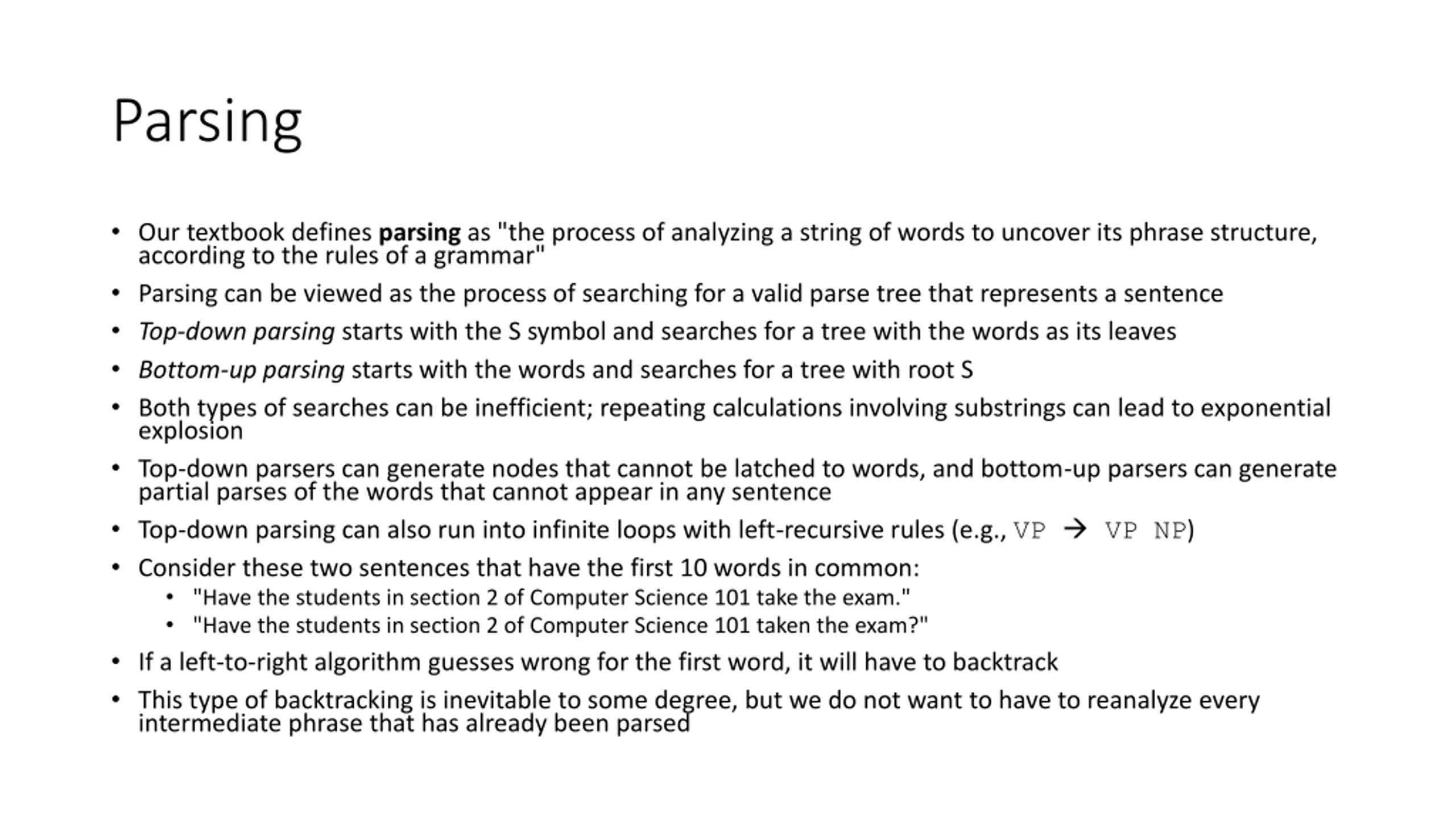 Parsing Our textbook defines parsing as "the process of analyzing a string of words to uncover its phrase structure, according to the rules of a grammar" Parsing can be viewed as the process of searching for a valid parse tree that represents a sentence Top-down parsing starts with the S symbol and searches for a tree with the words as its leaves Bottom-up parsing starts with the words and searches for a tree with root S Both types of searches can be inefficient; repeating calculations involving substrings can lead to exponential explosion Top-down parsers can generate nodes that cannot be latched to words, and bottom-up parsers can generate partial parses of the words that cannot appear in any sentence Top-down parsing can also run into infinite loops with left-recursive rules (e.g., VP VP NP) Consider these two sentences that have the first 10 words in common: "Have the students in section 2 of Computer Science 101 take the exam." "Have the students in section 2 of Computer Science 101 taken the exam?" If a left-to-right algorithm guesses wrong for the first word, it will have to backtrack This type of backtracking is inevitable to some degree, but we do not want to have to reanalyze every intermediate phrase that has already been parsed