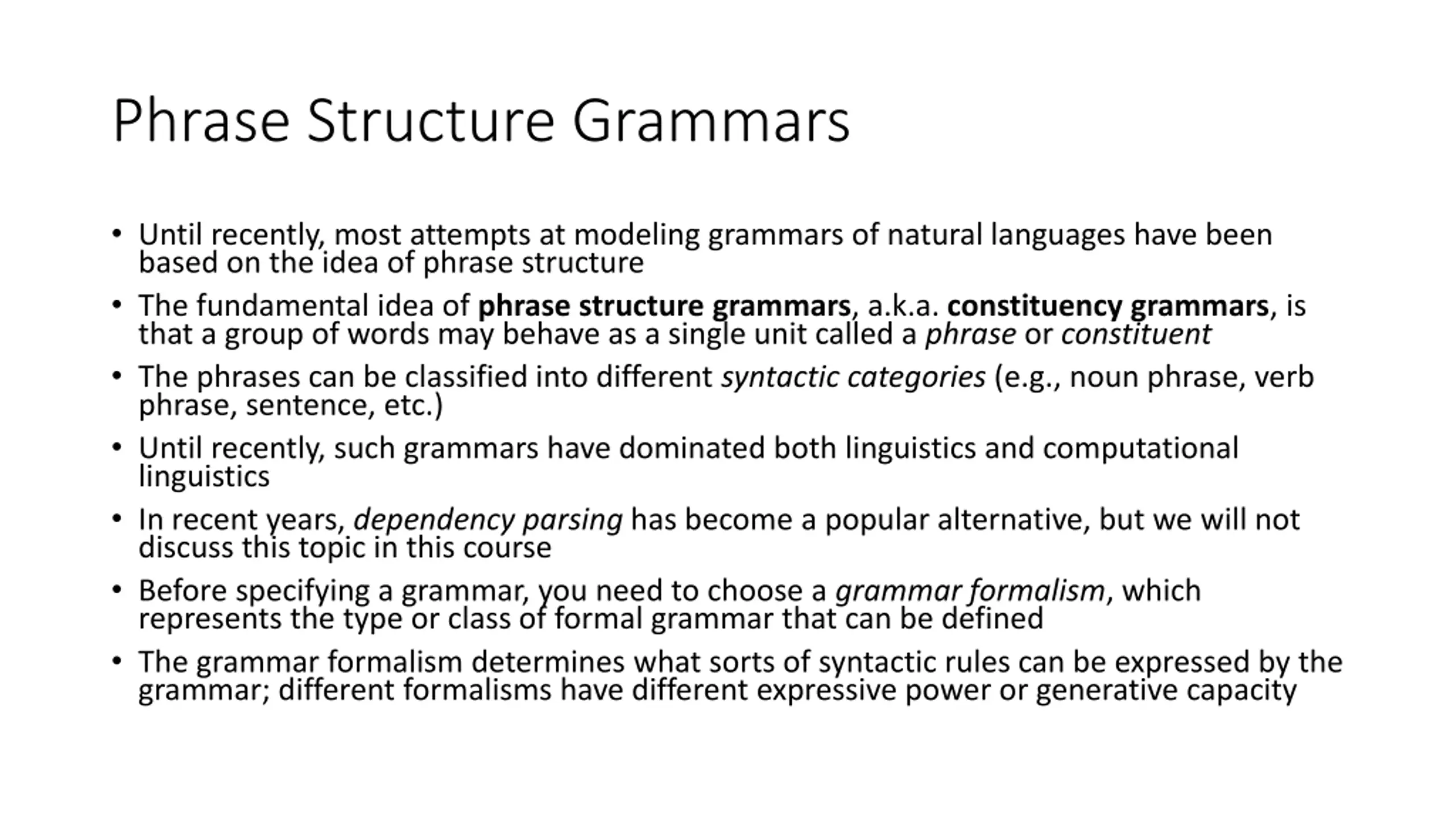Phrase Structure Grammars Until recently, most attempts at modeling grammars of natural languages have been based on the idea of phrase structure The fundamental idea of phrase structure grammars, a.k.a. constituency grammars, is that a group of words may behave as a single unit called a phrase or constituent The phrases can be classified into different syntactic categories (e.g., noun phrase, verb phrase, sentence, etc.) Until recently, such grammars have dominated both linguistics and computational linguistics In recent years, dependency parsing has become a popular alternative, but we will not discuss this topic in this course Before specifying a grammar, you need to choose a grammar formalism, which represents the type or class of formal grammar that can be defined The grammar formalism determines what sorts of syntactic rules can be expressed by the grammar; different formalisms have different expressive power or generative capacity