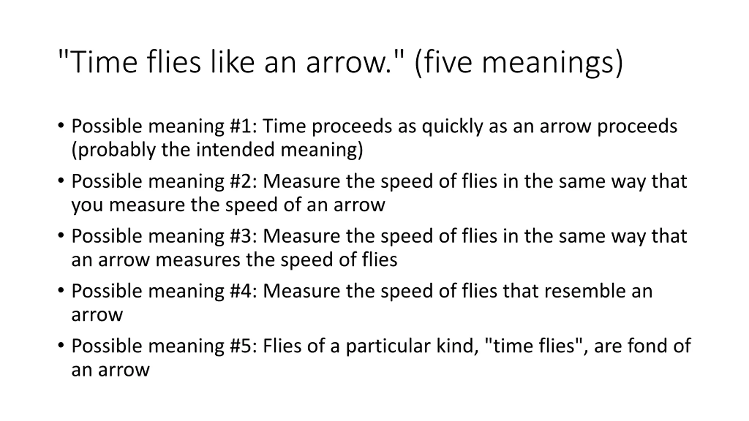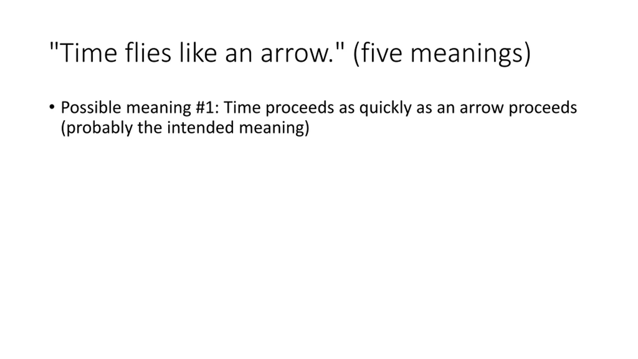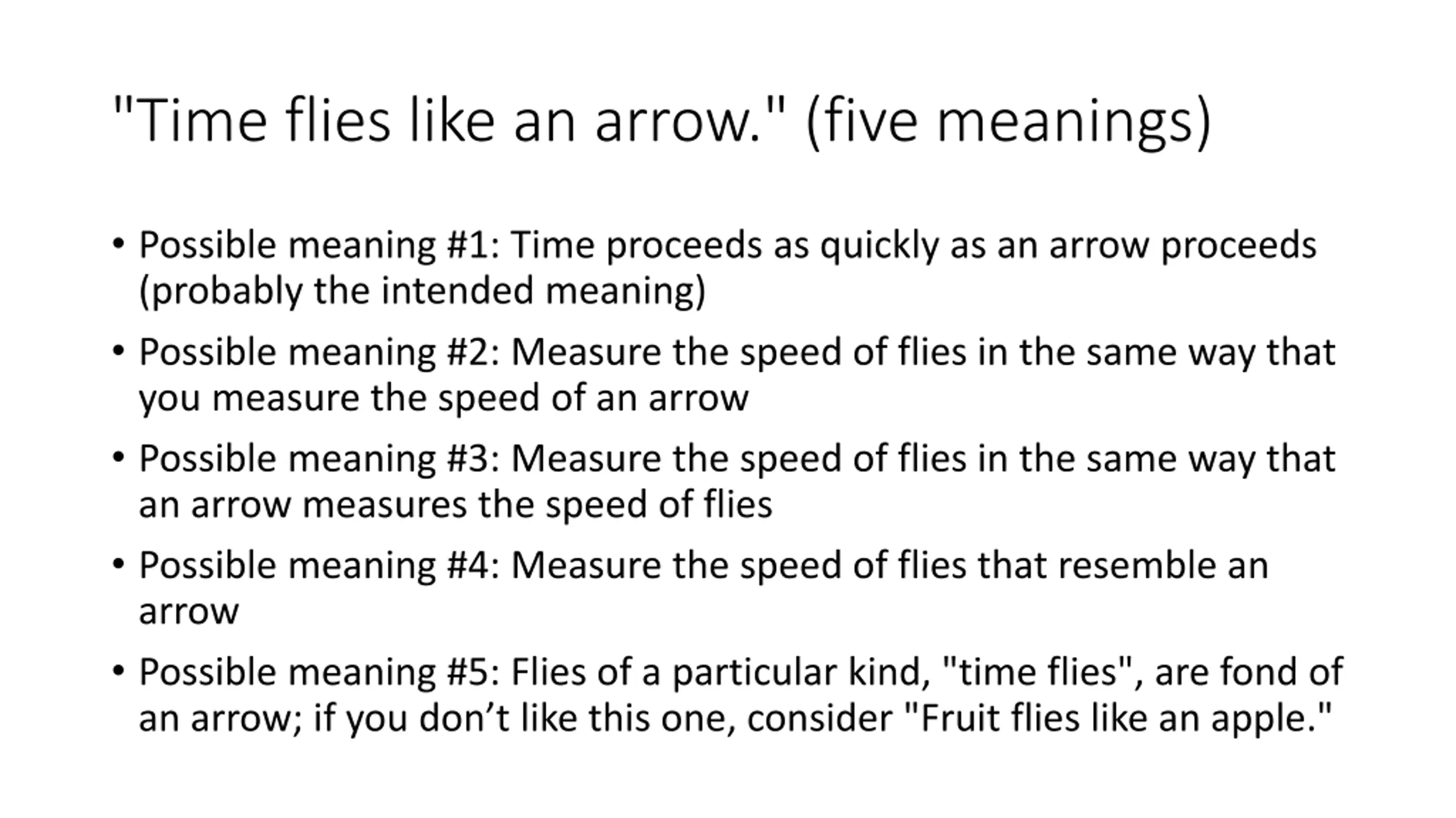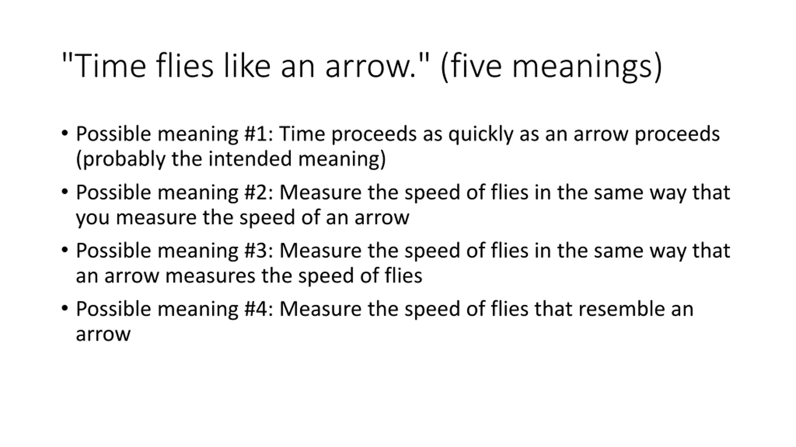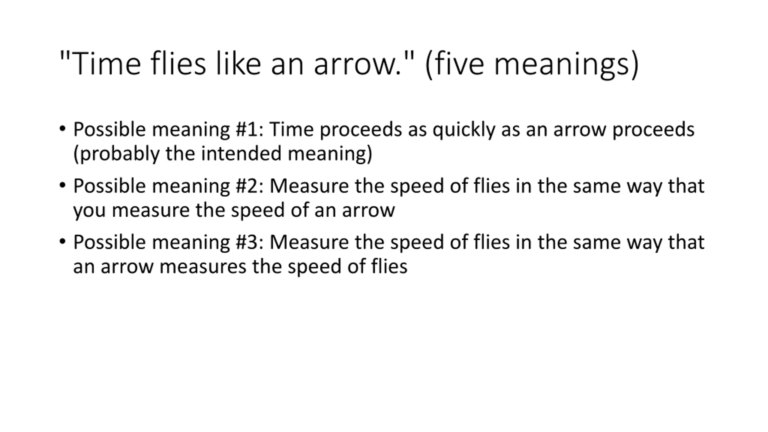 "Time flies like an arrow." (five meanings) Possible meaning #1: Time proceeds as quickly as an arrow proceeds (probably the intended meaning) Possible meaning #2: Measure the speed of flies in the same way that you measure the speed of an arrow Possible meaning #3: Measure the speed of flies in the same way that an arrow measures the speed of flies