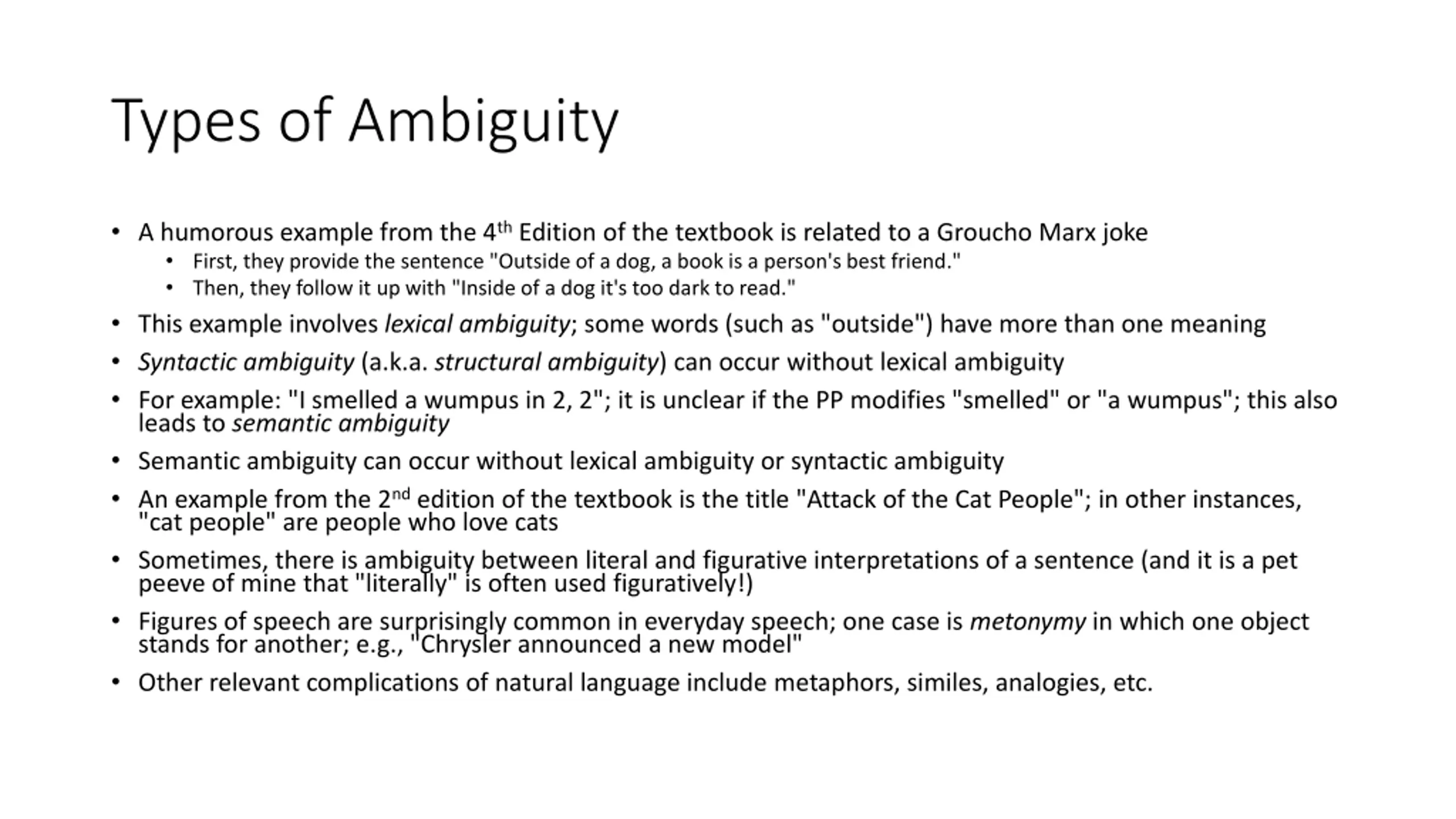 Types of Ambiguity A humorous example from the 4thEdition of the textbook is related to a Groucho Marx joke First, they provide the sentence "Outside of a dog, a book is a person's best friend." Then, they follow it up with "Inside of a dog it's too dark to read." This example involves lexical ambiguity; some words (such as "outside") have more than one meaning Syntactic ambiguity (a.k.a. structural ambiguity) can occur without lexical ambiguity For example: "I smelled a wumpus in 2, 2"; it is unclear if the PP modifies "smelled" or "a wumpus"; this also leads to semantic ambiguity Semantic ambiguity can occur without lexical ambiguity or syntactic ambiguity An example from the 2ndedition of the textbook is the title "Attack of the Cat People"; in other instances, "cat people" are people who love cats Sometimes, there is ambiguity between literal and figurative interpretations of a sentence (and it is a pet peeve of mine that "literally" is often used figuratively!) Figures of speech are surprisingly common in everyday speech; one case is metonymy in which one object stands for another; e.g., "Chrysler announced a new model" Other relevant complications of natural language include metaphors, similes, analogies, etc.