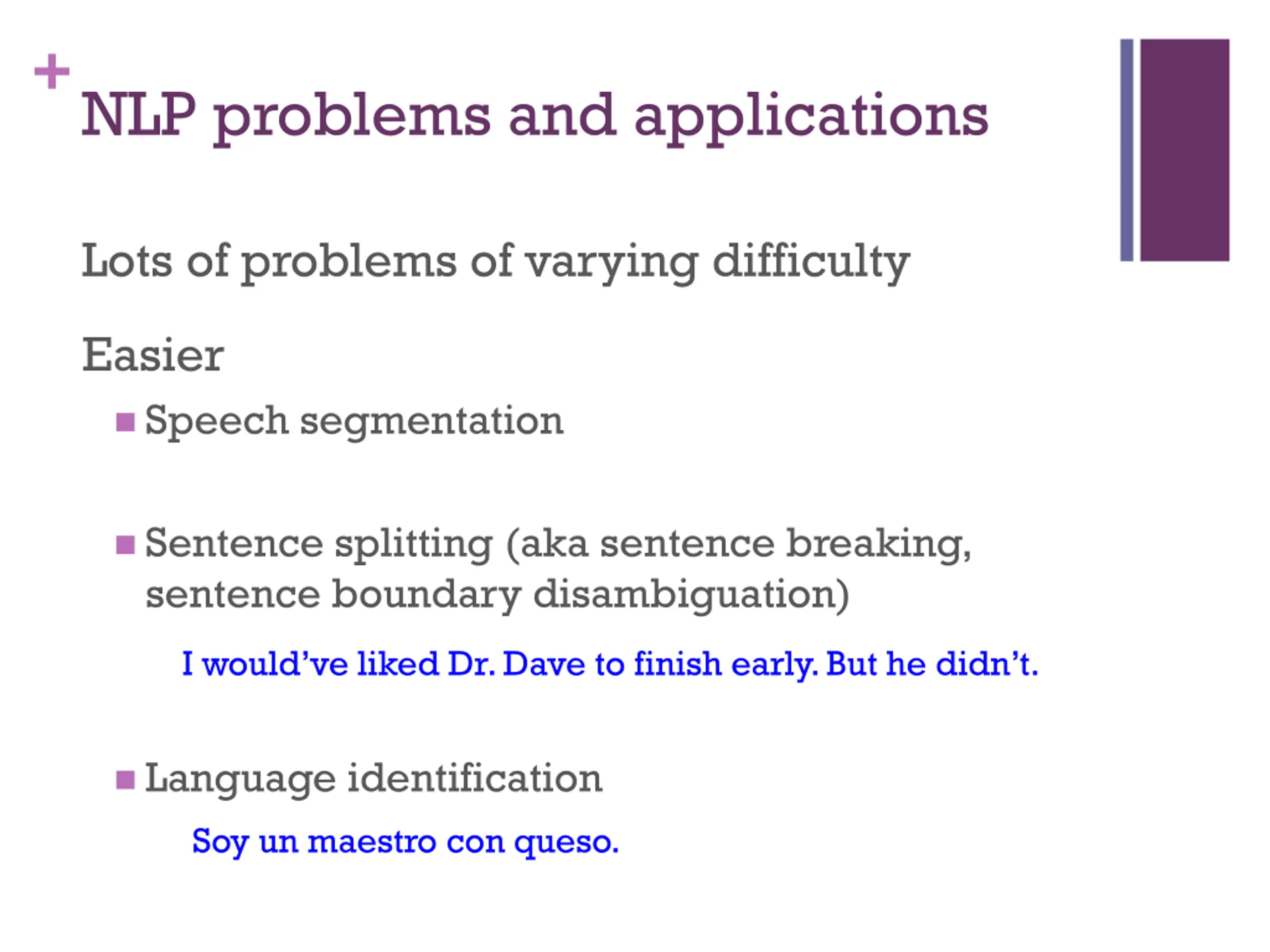 +NLP problems and applications Lots of problems of varying difficulty Easier Speech segmentation Sentence splitting (aka sentence breaking, sentence boundary disambiguation) I would ve liked Dr. Dave to finish early. But he didn t. Language identification Soy un maestro con queso.