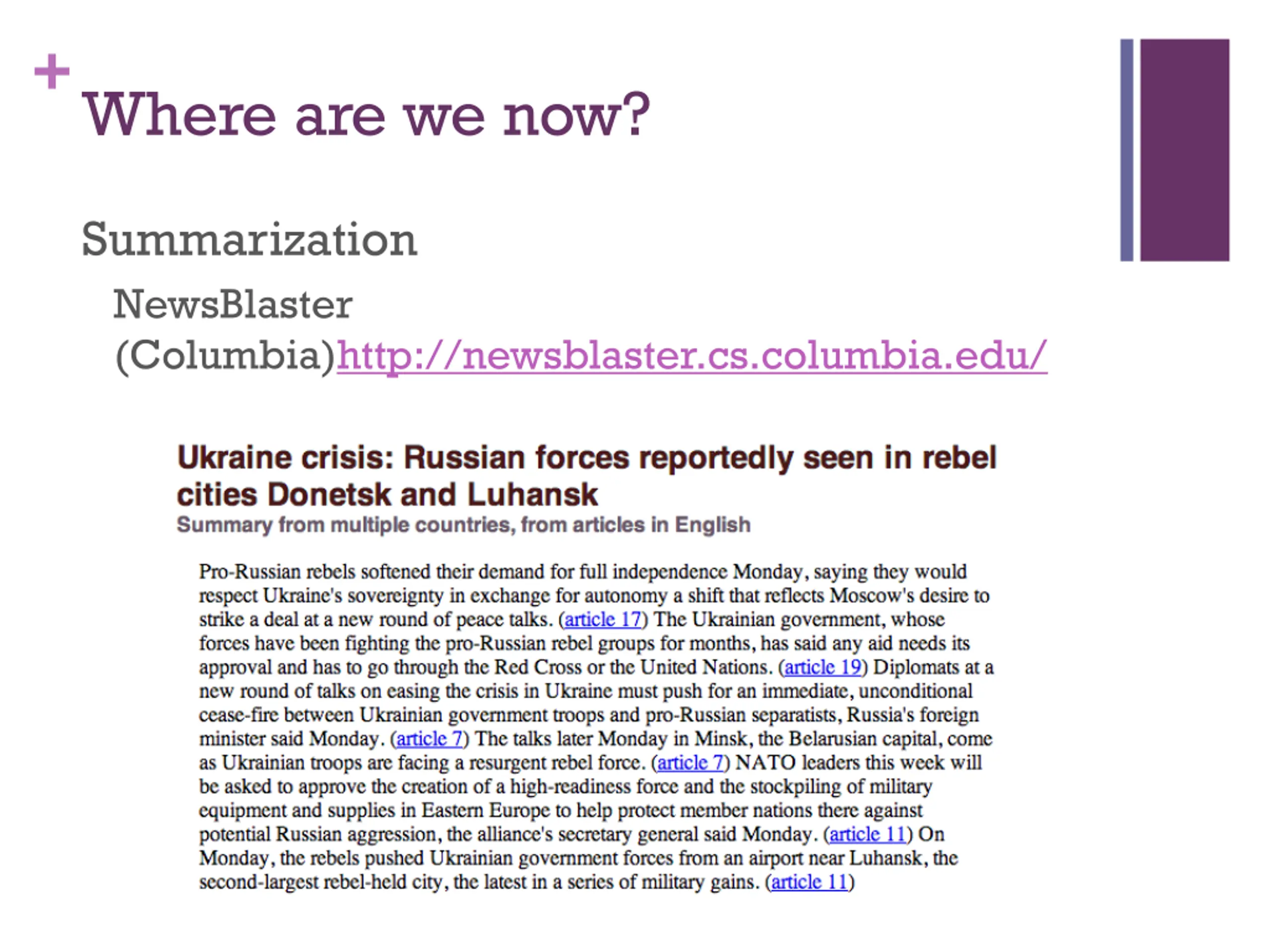 +Where are we now? Summarization NewsBlaster (Columbia)http://newsblaster.cs.columbia.edu/