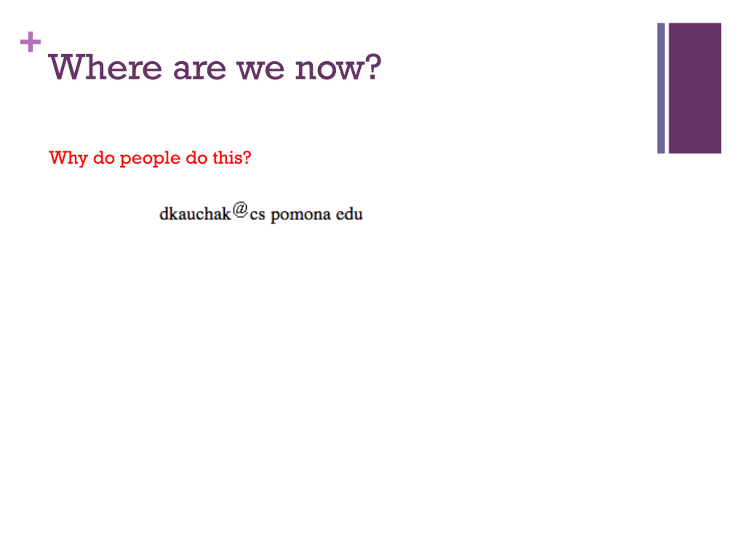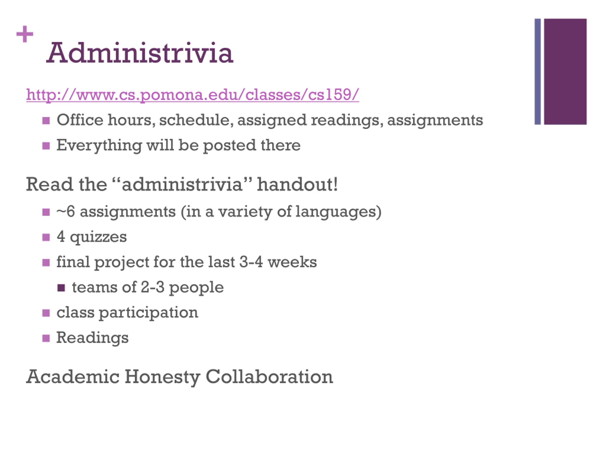 +Administrivia http://www.cs.pomona.edu/classes/cs159/ Office hours, schedule, assigned readings, assignments Everything will be posted there Read the administrivia handout! ~6 assignments (in a variety of languages) 4 quizzes final project for the last 3-4 weeks teams of 2-3 people class participation Readings Academic Honesty Collaboration