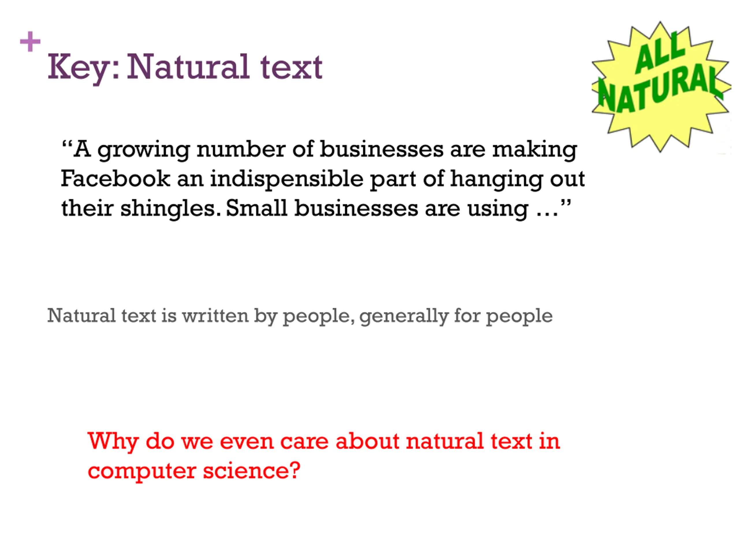 +Key: Natural text A growing number of businesses are making Facebook an indispensible part of hanging out their shingles. Small businesses are using Natural text is written by people, generally for people Why do we even care about natural text in computer science?