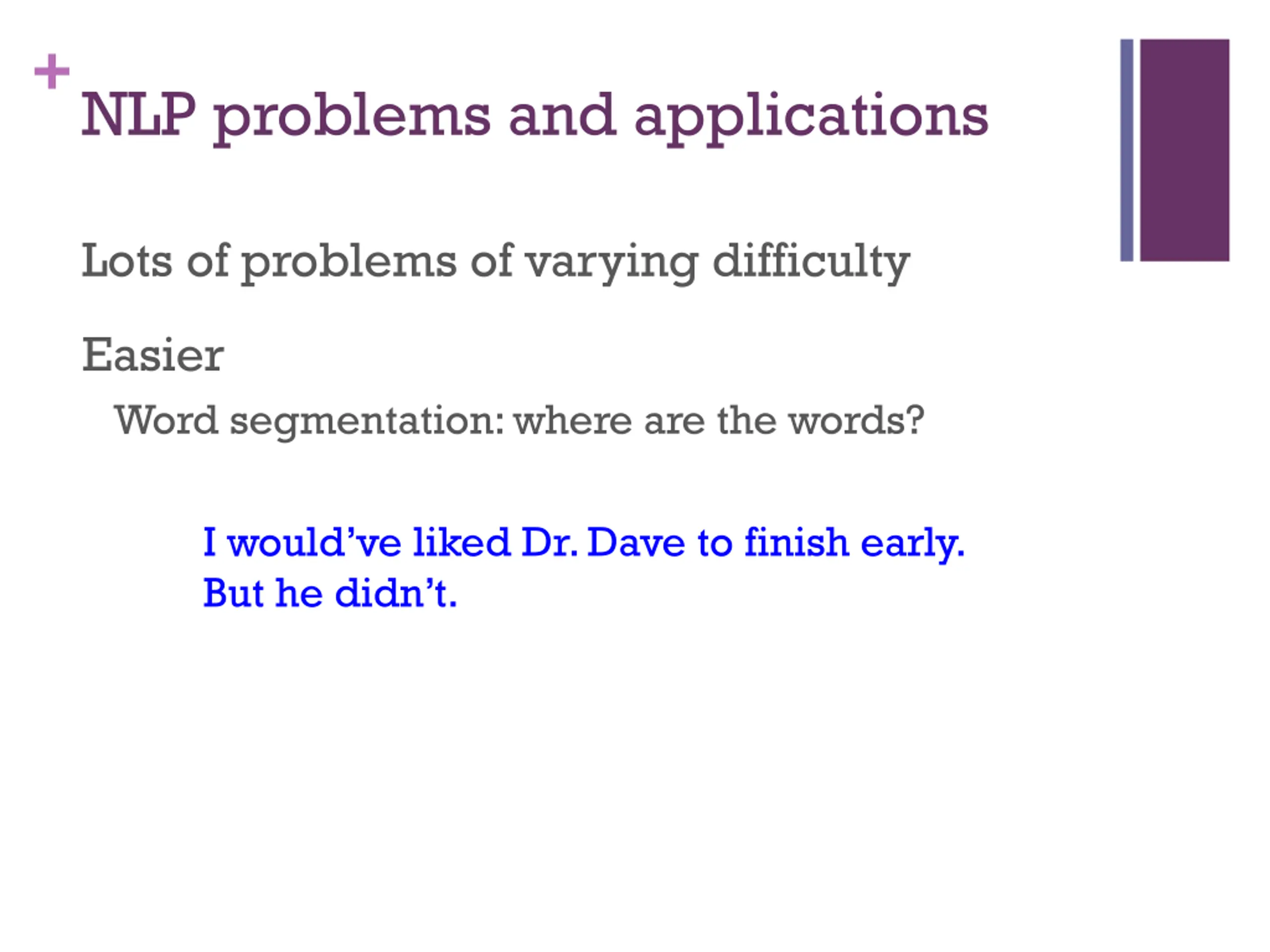 +NLP problems and applications Lots of problems of varying difficulty Easier Word segmentation: where are the words? I would ve liked Dr. Dave to finish early. But he didn t.