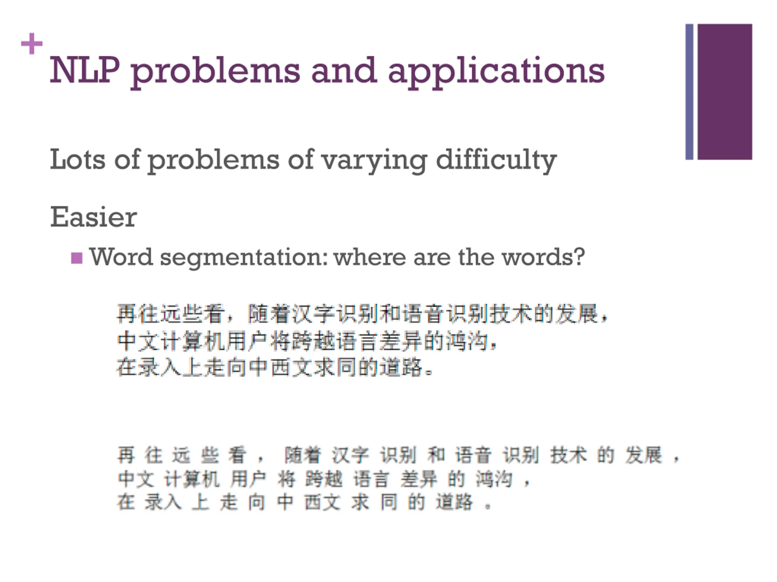 +NLP problems and applications Lots of problems of varying difficulty Easier Word segmentation: where are the words?