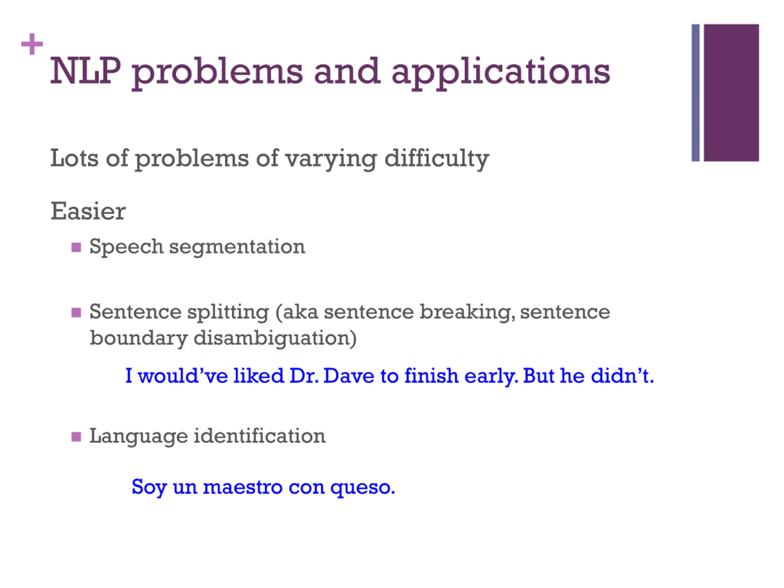 +NLP problems and applications Lots of problems of varying difficulty Easier Speech segmentation Sentence splitting (aka sentence breaking, sentence boundary disambiguation) I would ve liked Dr. Dave to finish early. But he didn t. Language identification Soy un maestro con queso.