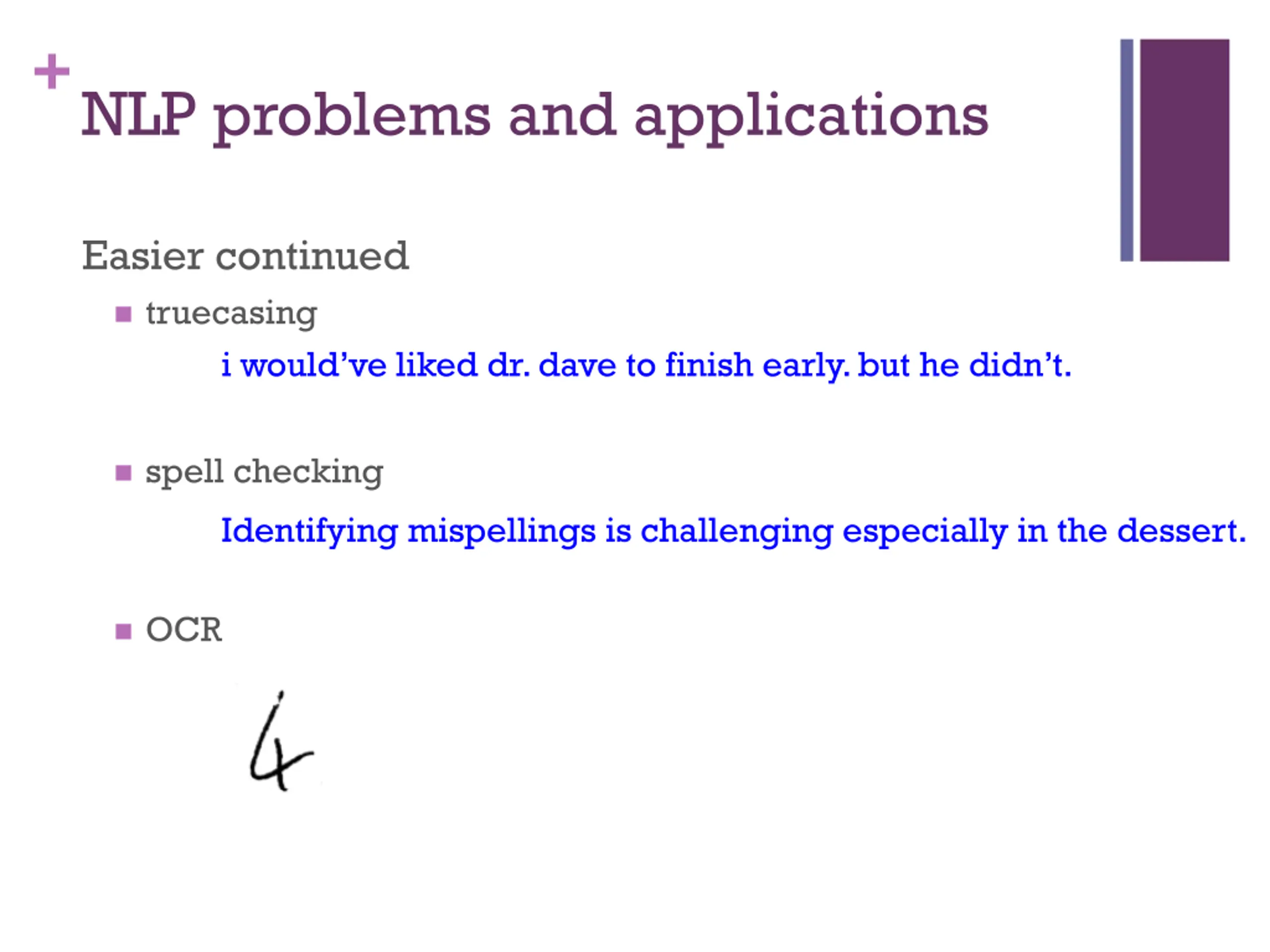 +NLP problems and applications Easier continued truecasing i would ve liked dr. dave to finish early. but he didn t. spell checking Identifying mispellings is challenging especially in the dessert. OCR