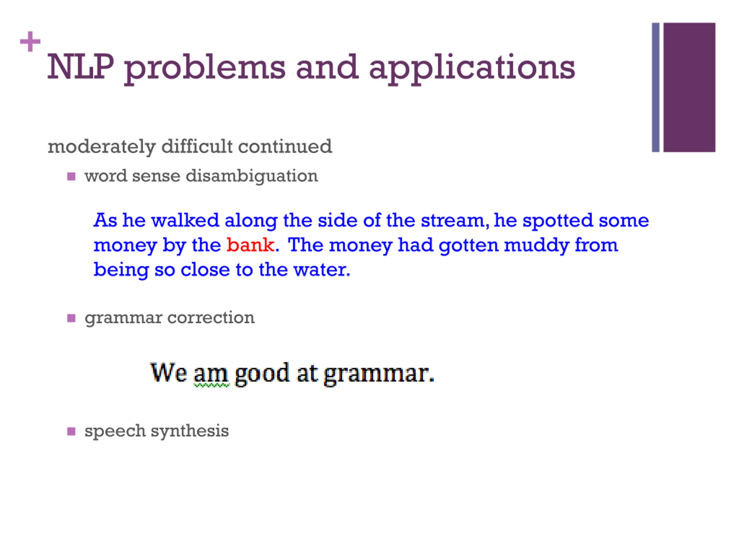 +NLP problems and applications moderately difficult continued word sense disambiguation As he walked along the side of the stream, he spotted some money by the bank. The money had gotten muddy from being so close to the water. grammar correction speech synthesis
