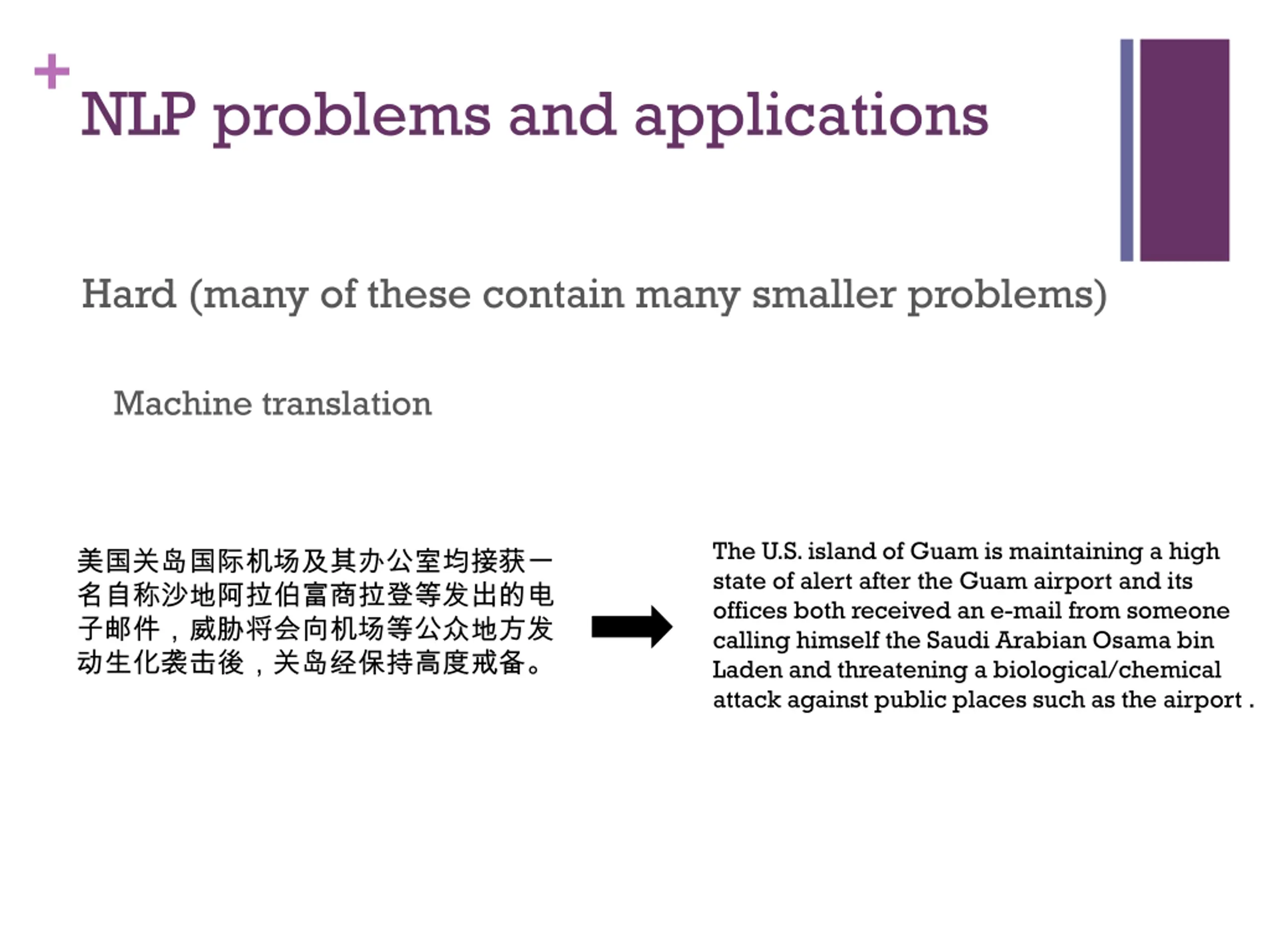 +NLP problems and applications Hard (many of these contain many smaller problems) Machine translation The U.S. island of Guam is maintaining a high state of alert after the Guamairport and its offices both received an e-mail from someone calling himself the Saudi Arabian Osama bin Laden and threatening a biological/chemical attack against public places such as the airport .