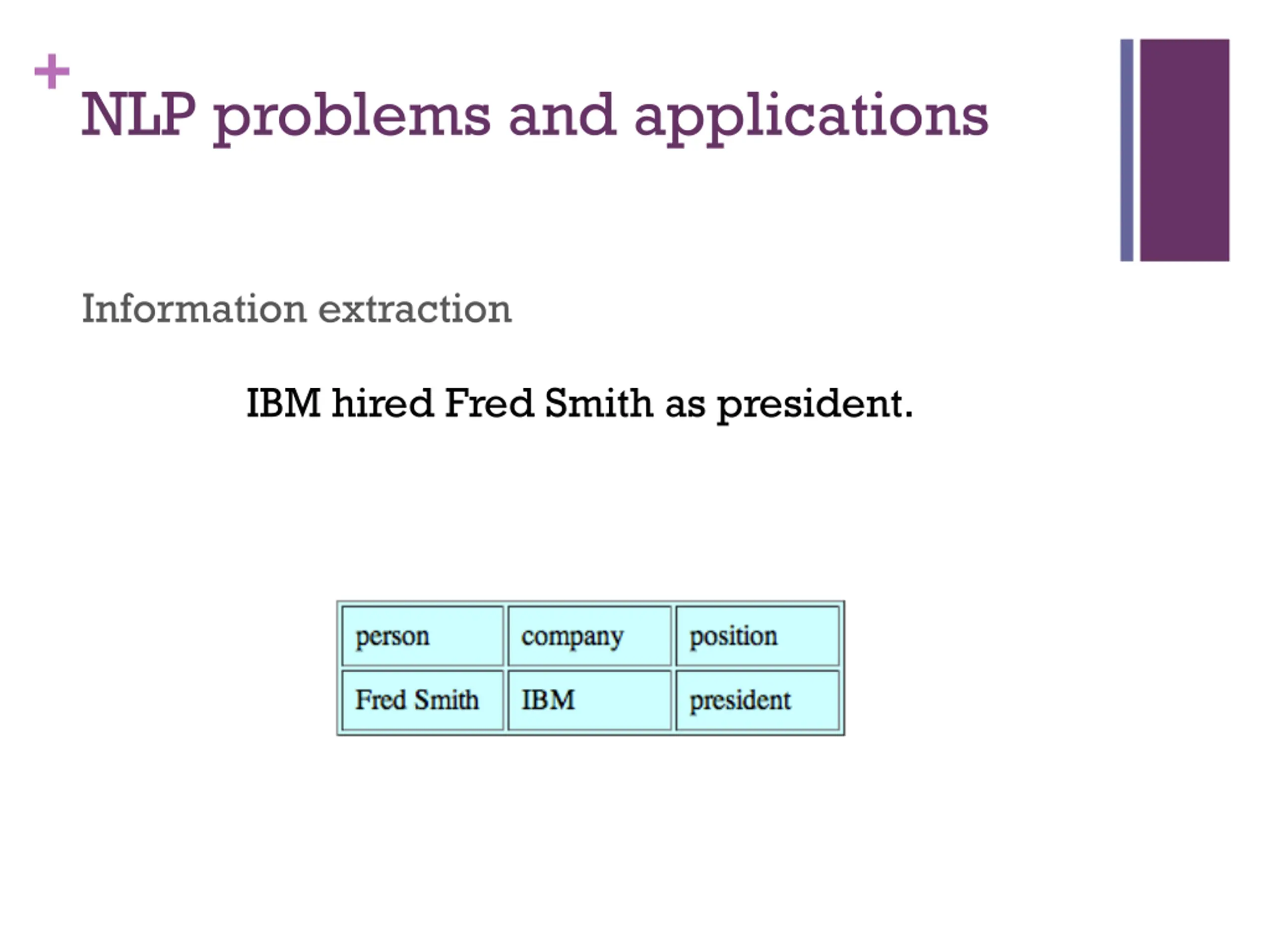 +NLP problems and applications Information extraction IBM hired Fred Smith as president.