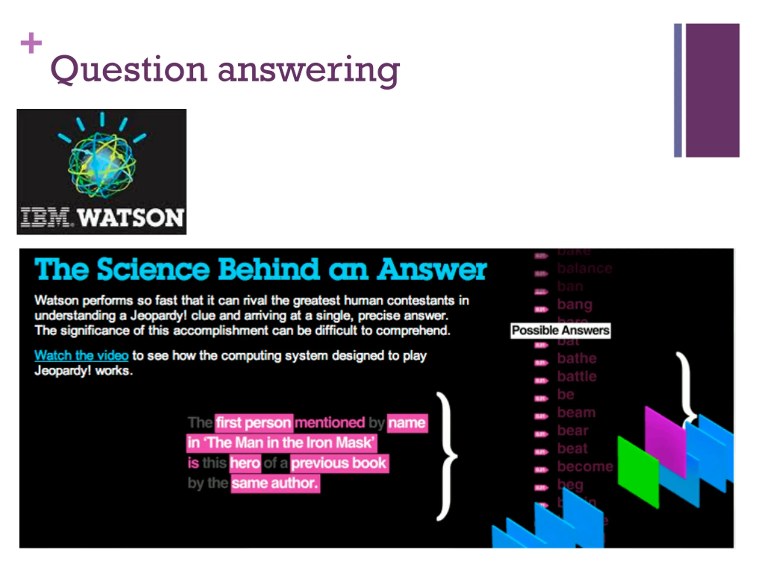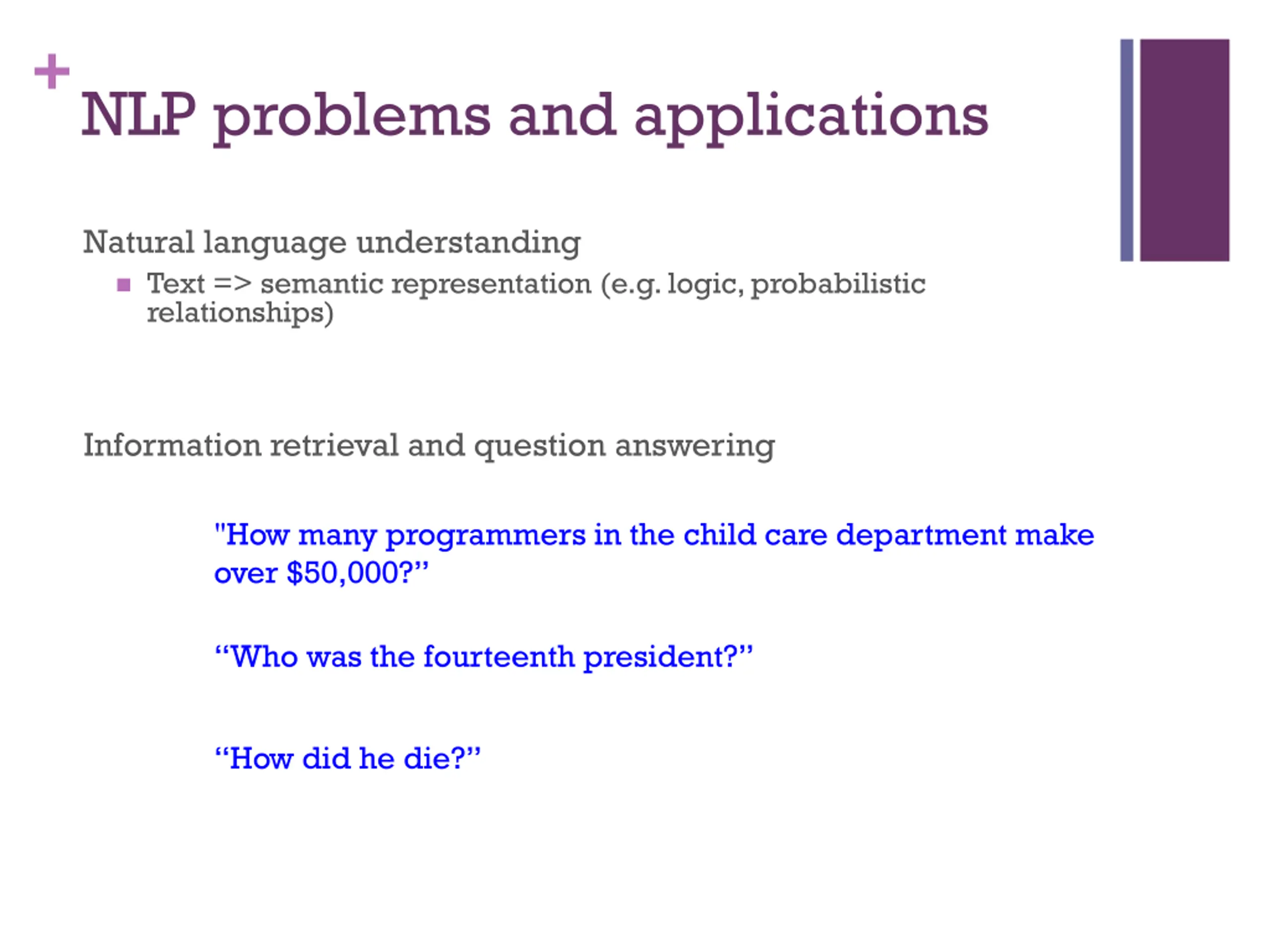 +NLP problems and applications Natural language understanding Text => semantic representation (e.g. logic, probabilistic relationships) Information retrieval and question answering "How many programmers in the child care department make over $50,000? Who was the fourteenth president? How did he die?