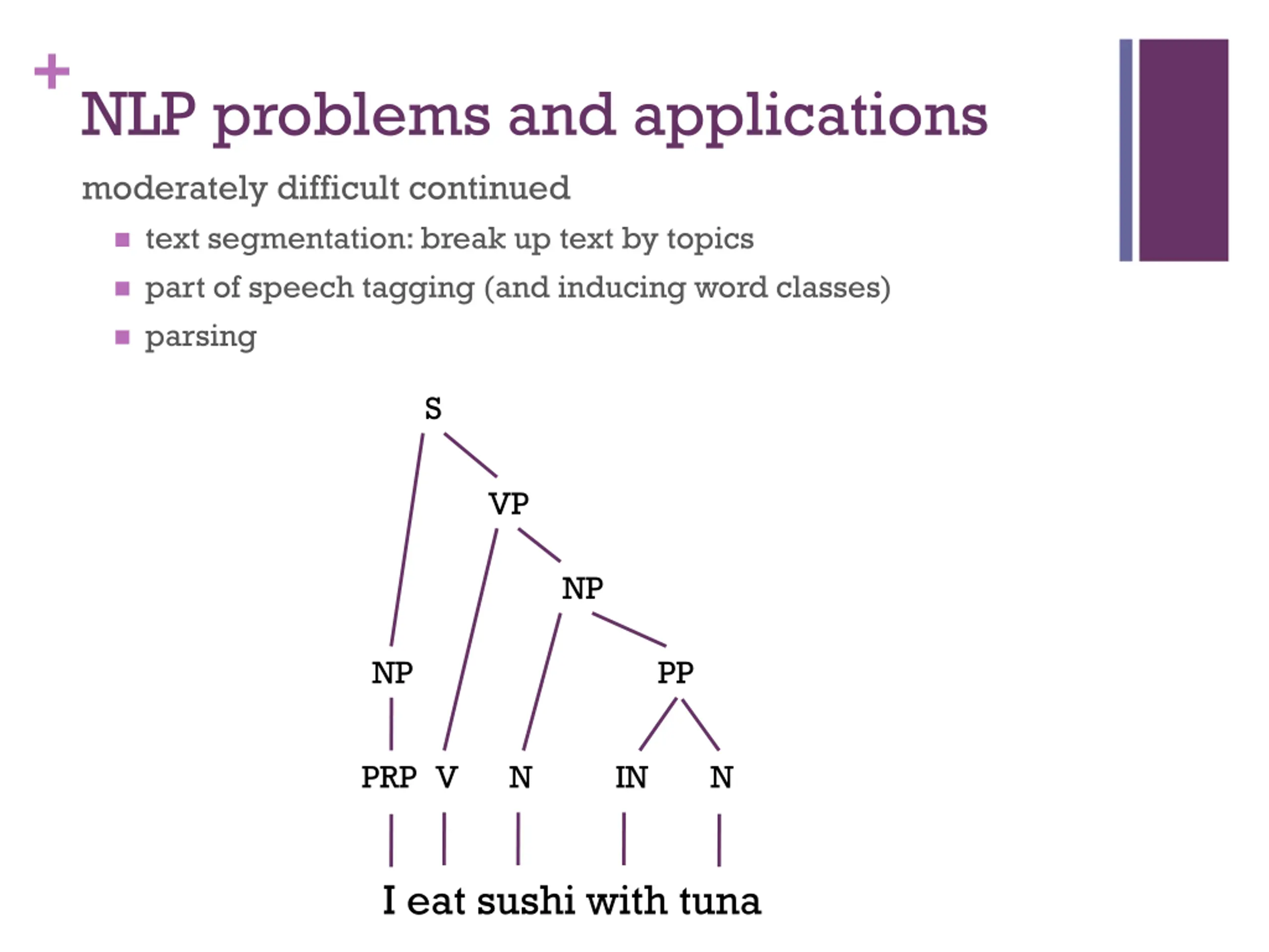 +NLP problems and applications moderately difficult continued text segmentation: break up text by topics part of speech tagging (and inducing word classes) parsing S VP NP NP PP PRP V N IN N I eat sushi with tuna