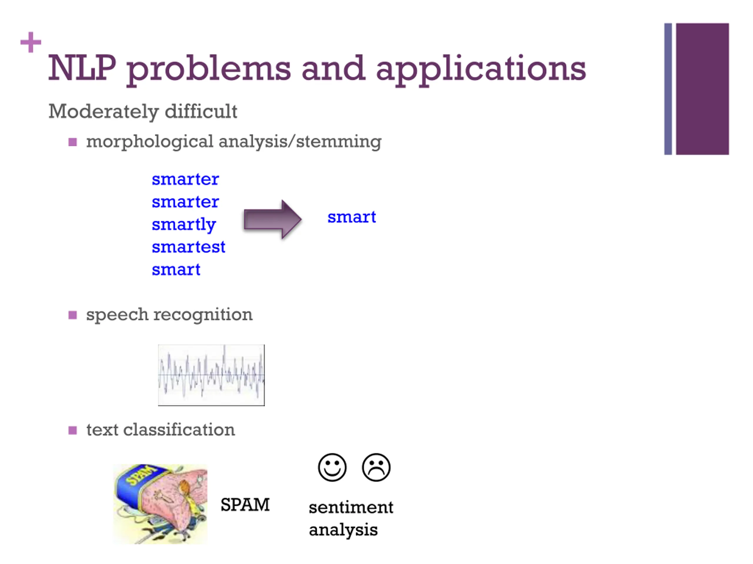 +NLP problems and applications Moderately difficult morphological analysis/stemming smarter smarter smartly smartest smart smart speech recognition text classification sentiment analysis SPAM