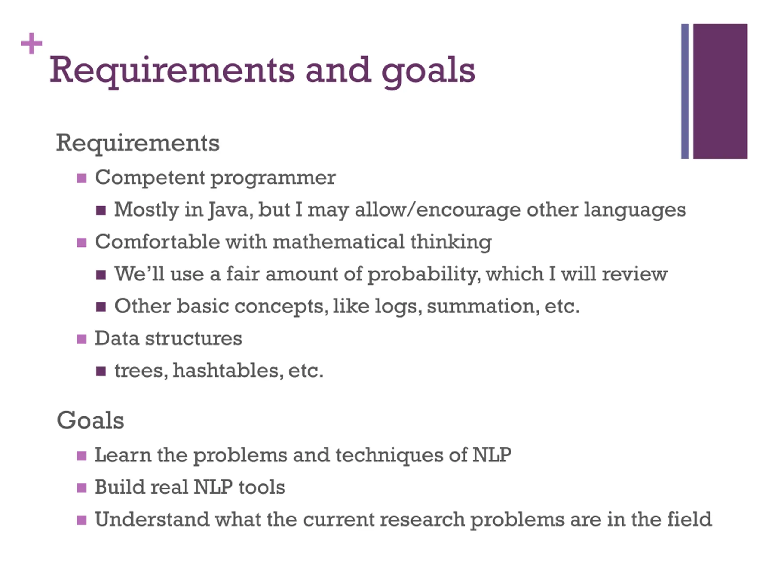 +Requirements and goals Requirements Competent programmer Mostly in Java, but I may allow/encourage other languages Comfortable with mathematical thinking We ll use a fair amount of probability, which I will review Other basic concepts, like logs, summation, etc. Data structures trees, hashtables, etc. Goals Learn the problems and techniques of NLP Build real NLP tools Understand what the current research problems are in the field
