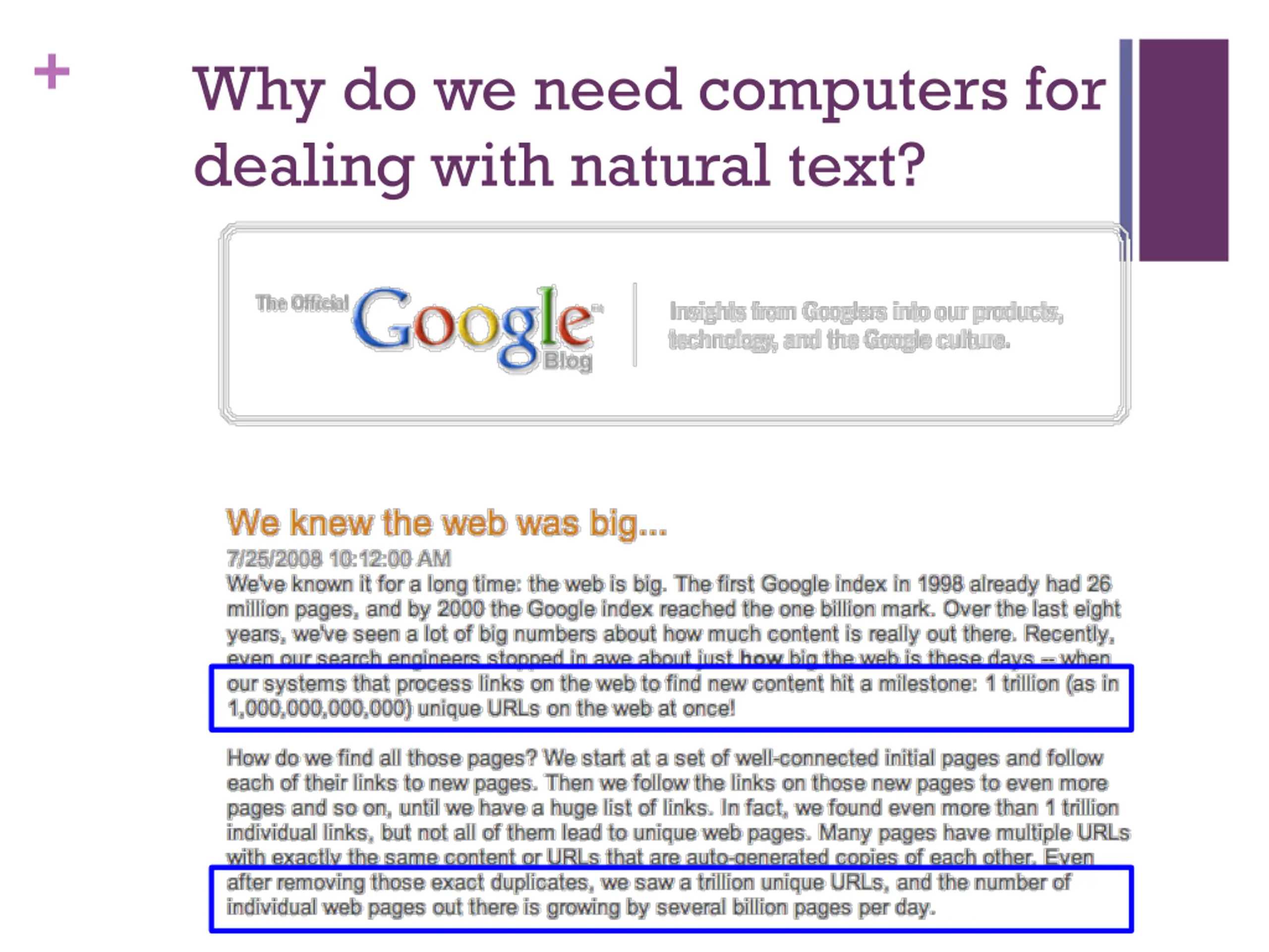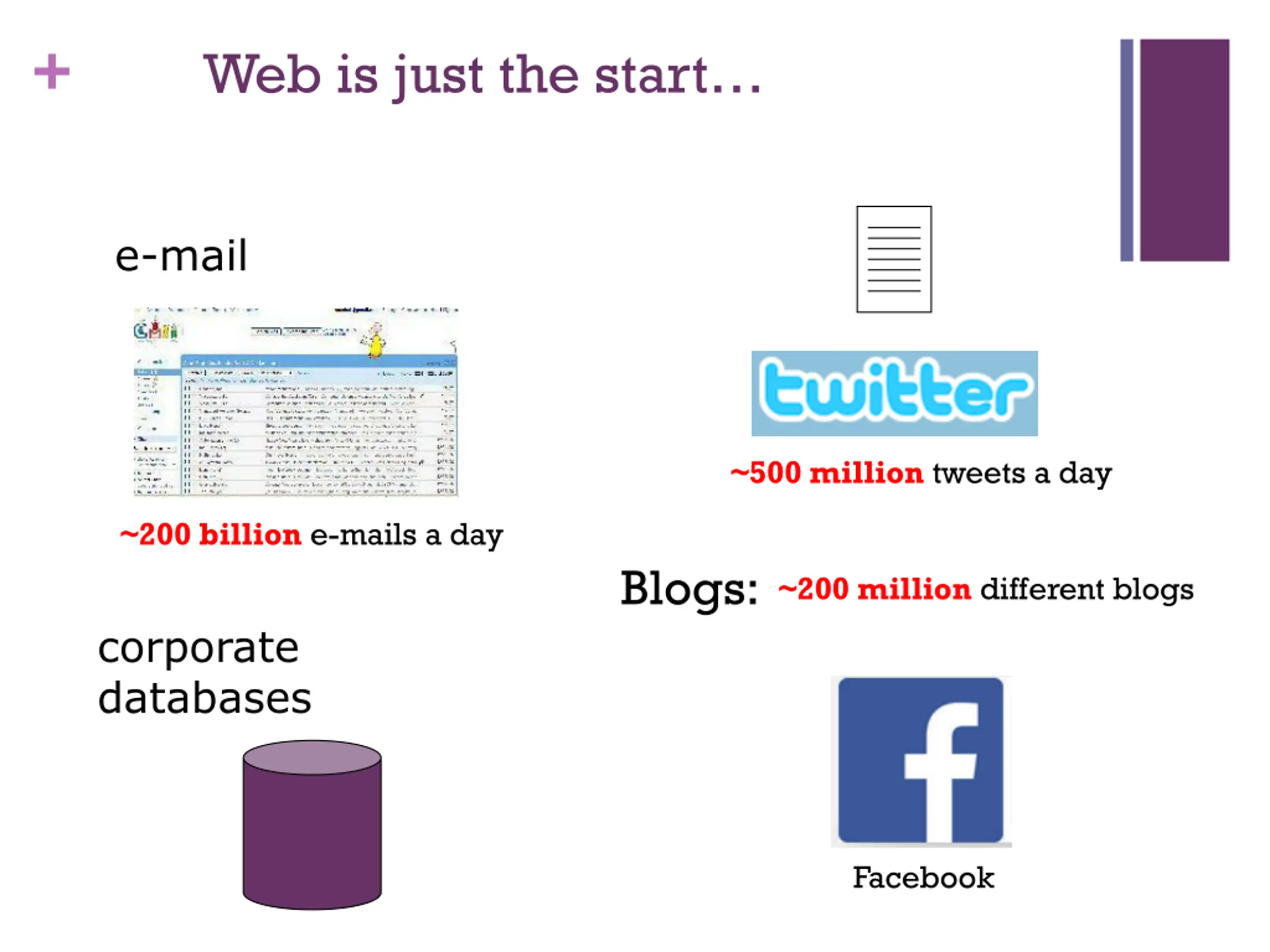 + Web is just the start e-mail ~500 million tweets a day ~200 billion e-mails a day Blogs: ~200 million different blogs corporate databases Facebook