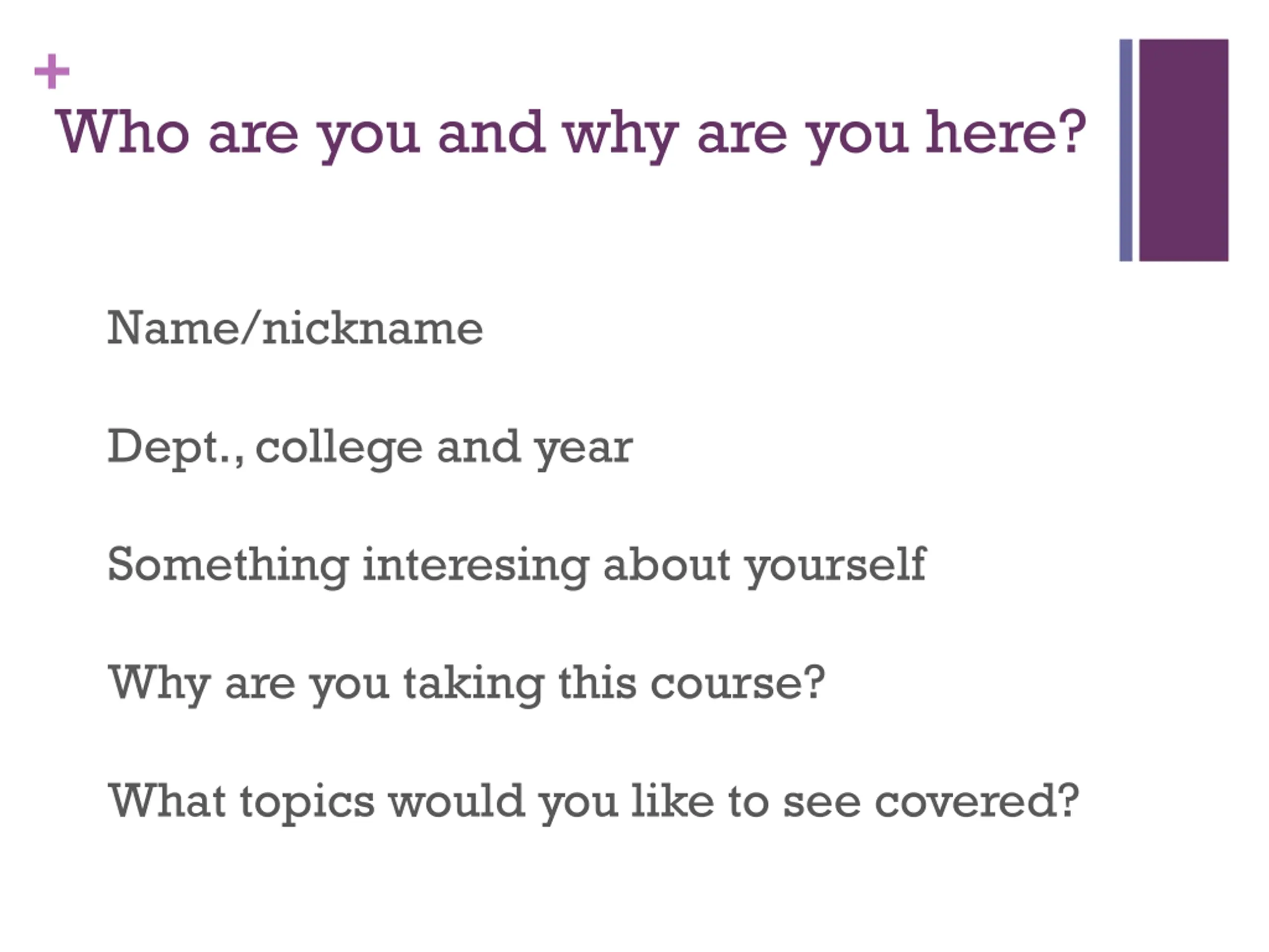 + Who are you and why are you here? Name/nickname Dept., college and year Something interesing about yourself Why are you taking this course? What topics would you like to see covered?