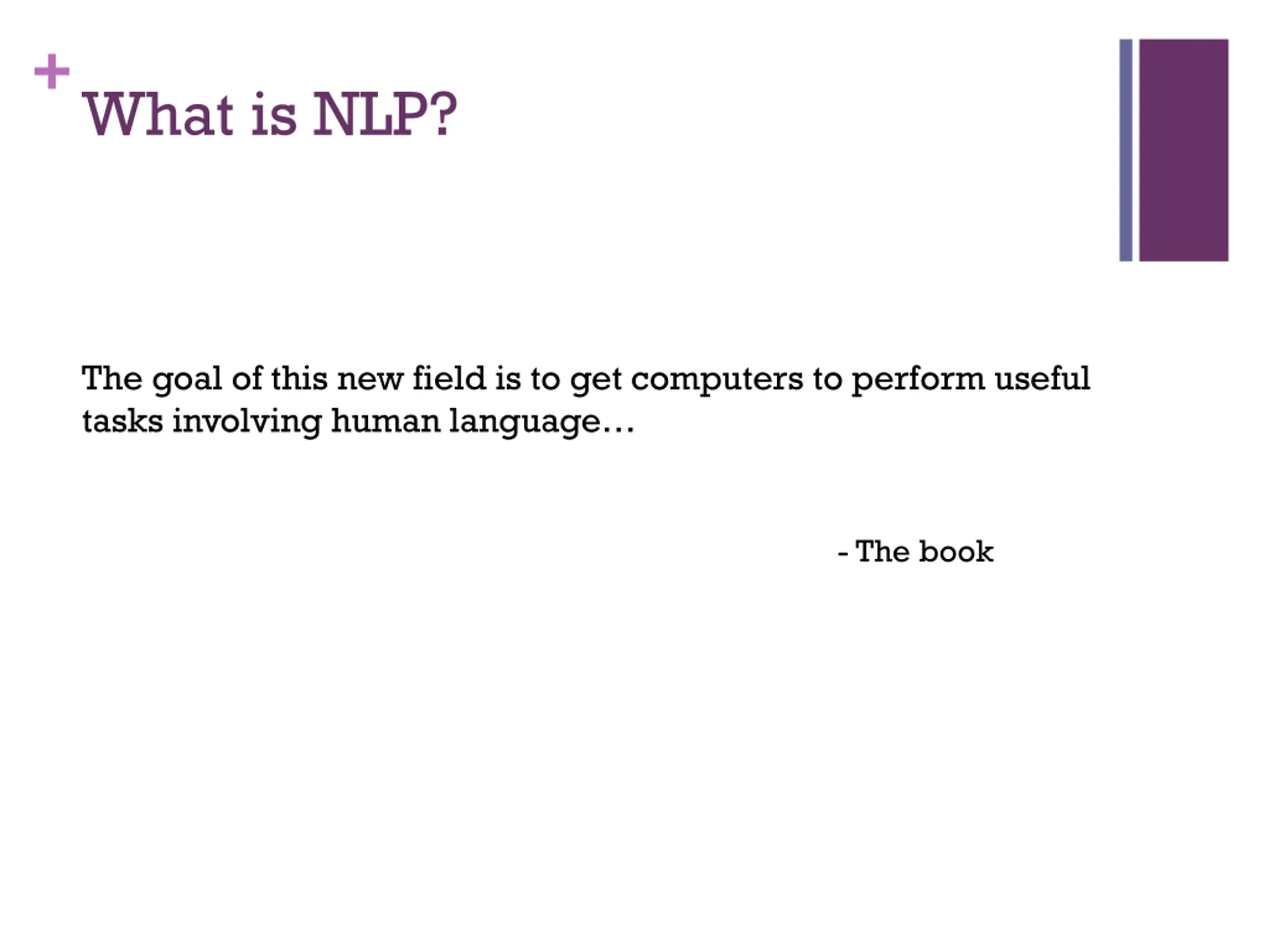+What is NLP? The goal of this new field is to get computers to perform useful tasks involving human language - The book