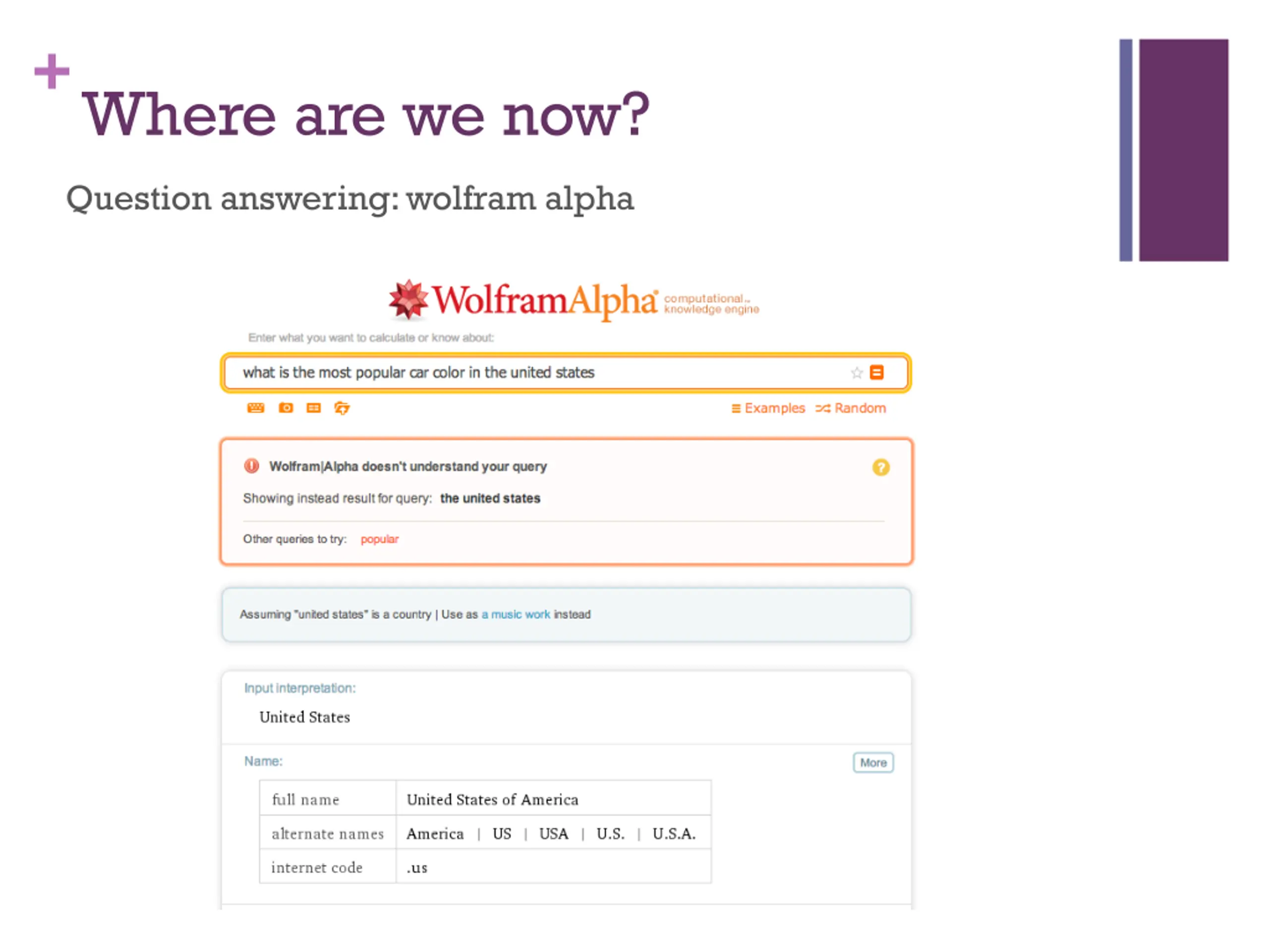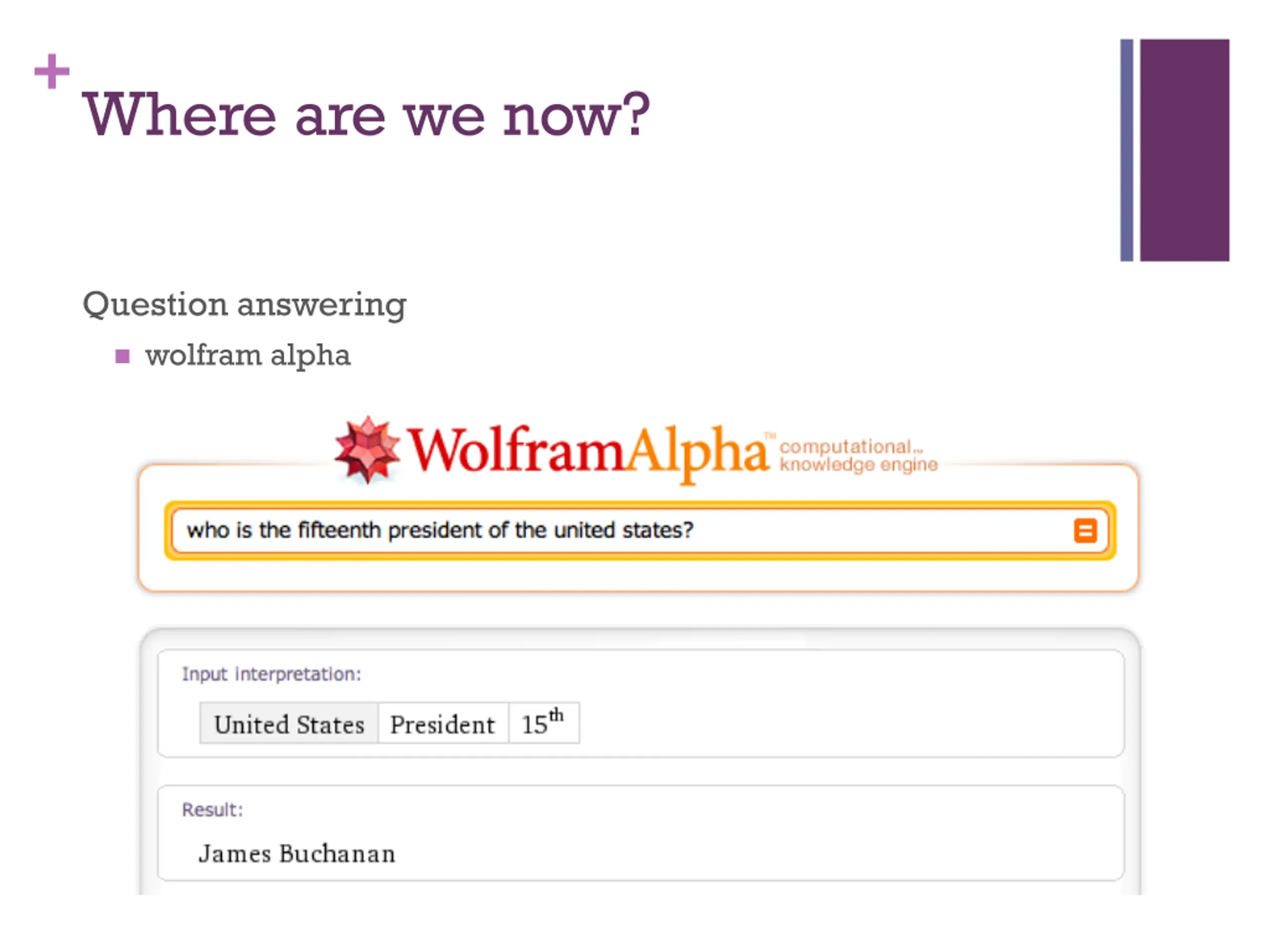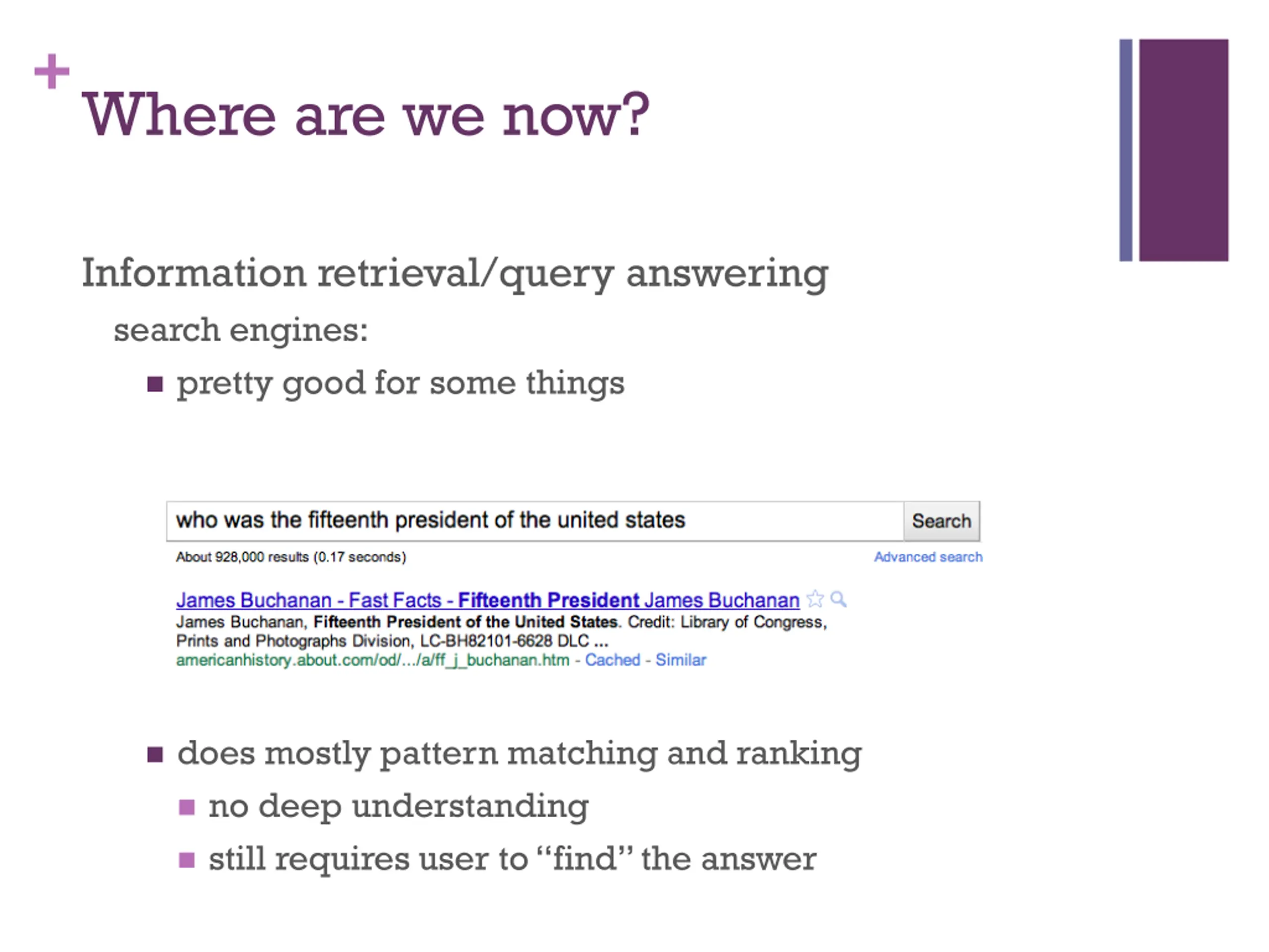 +Where are we now? Information retrieval/query answering search engines: pretty good for some things does mostly pattern matching and ranking no deep understanding still requires user to find the answer