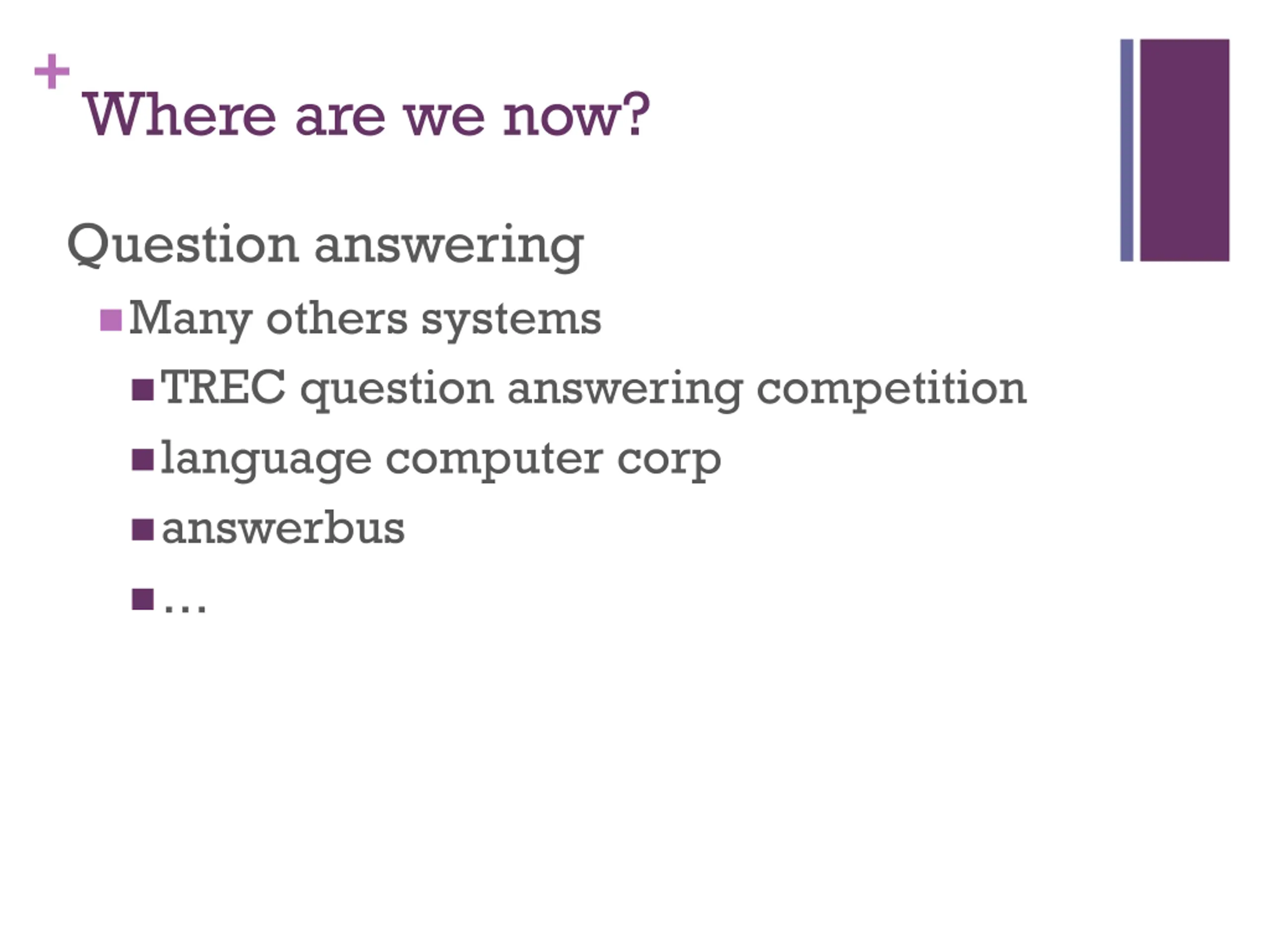 +Where are we now? Question answering Many others systems TREC question answering competition language computer corp answerbus
