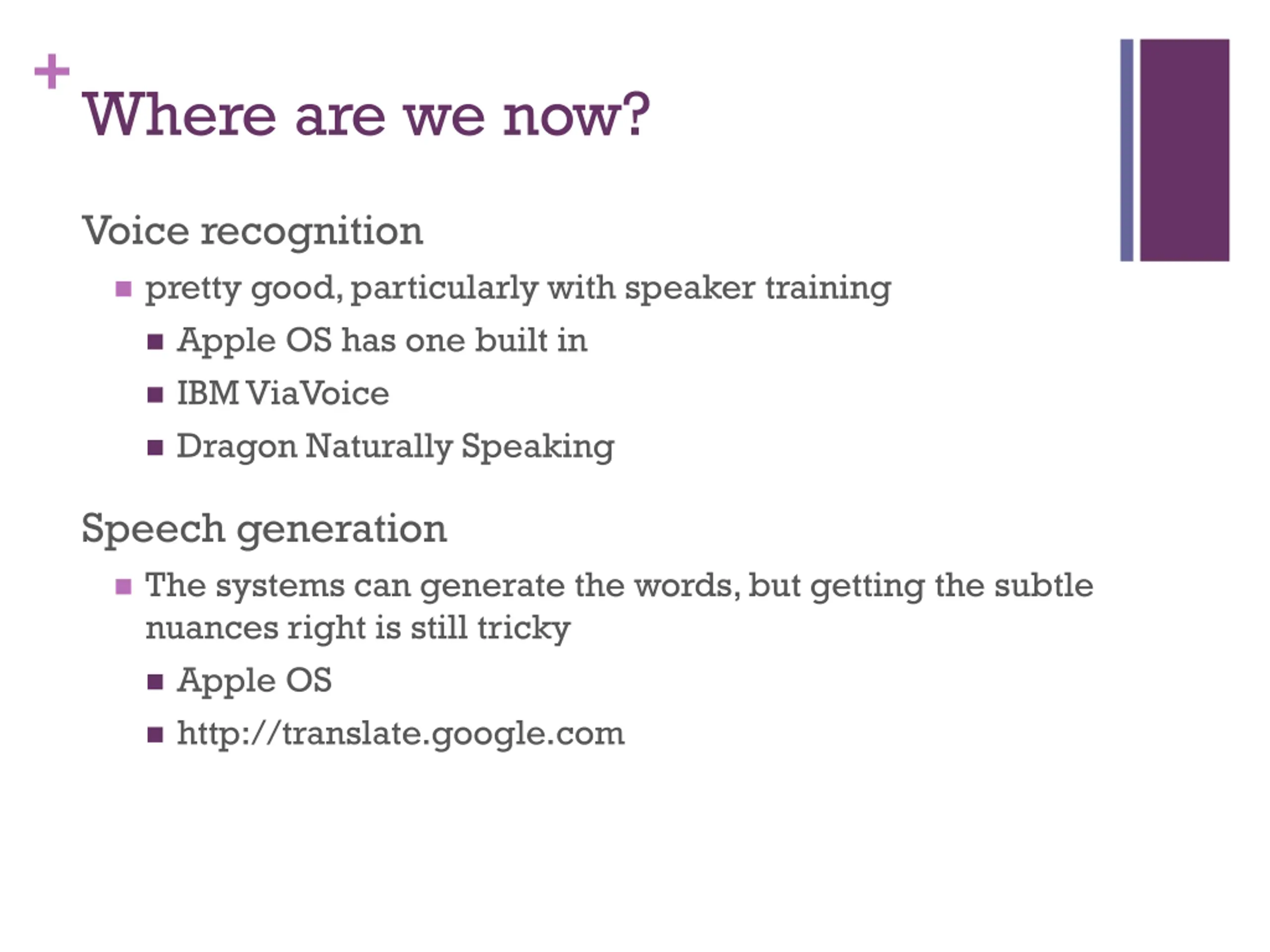 +Where are we now? Voice recognition pretty good, particularly with speaker training Apple OS has one built in IBM ViaVoice Dragon Naturally Speaking Speech generation The systems can generate the words, but getting the subtle nuances right is still tricky Apple OS http://translate.google.com