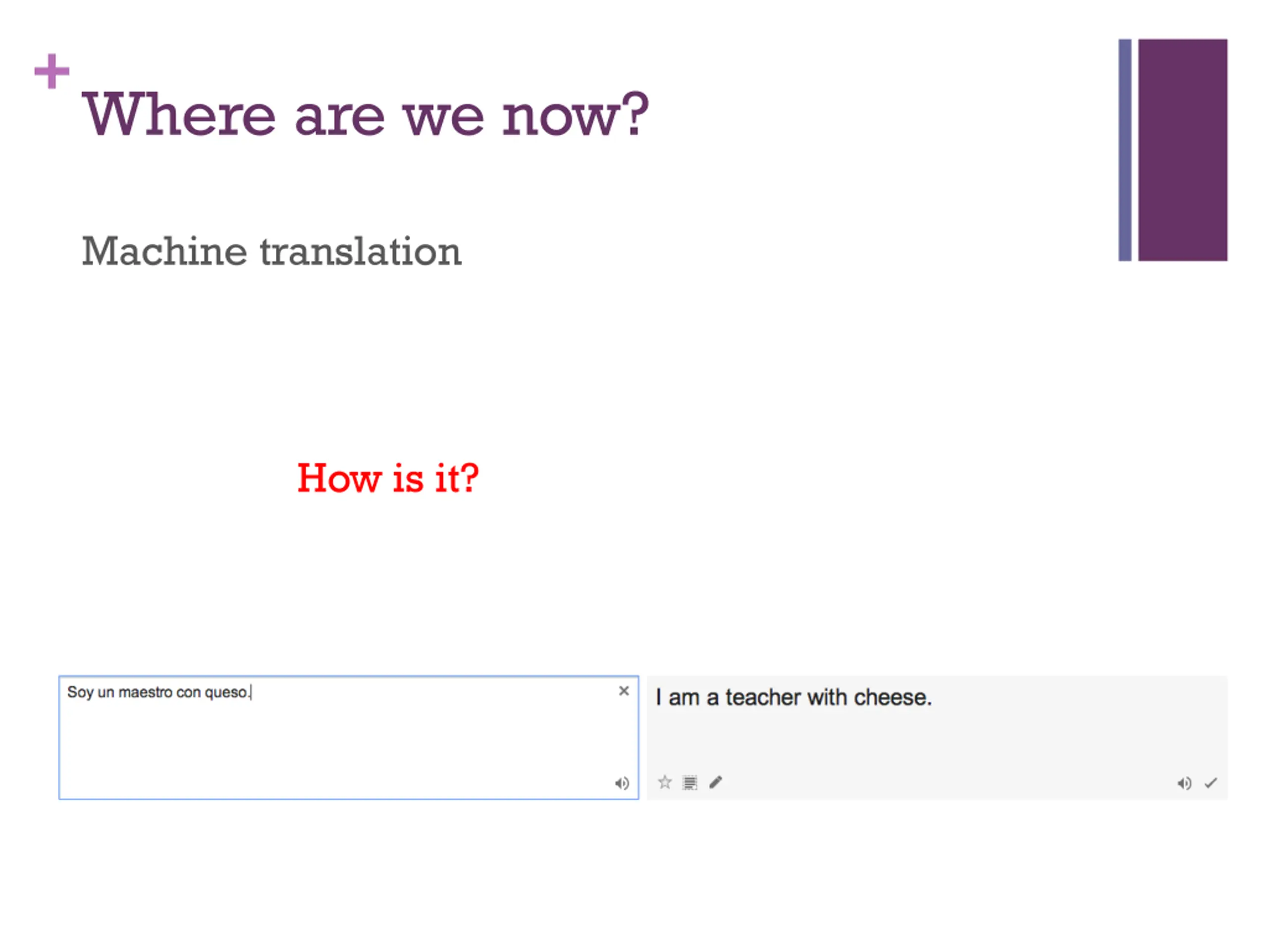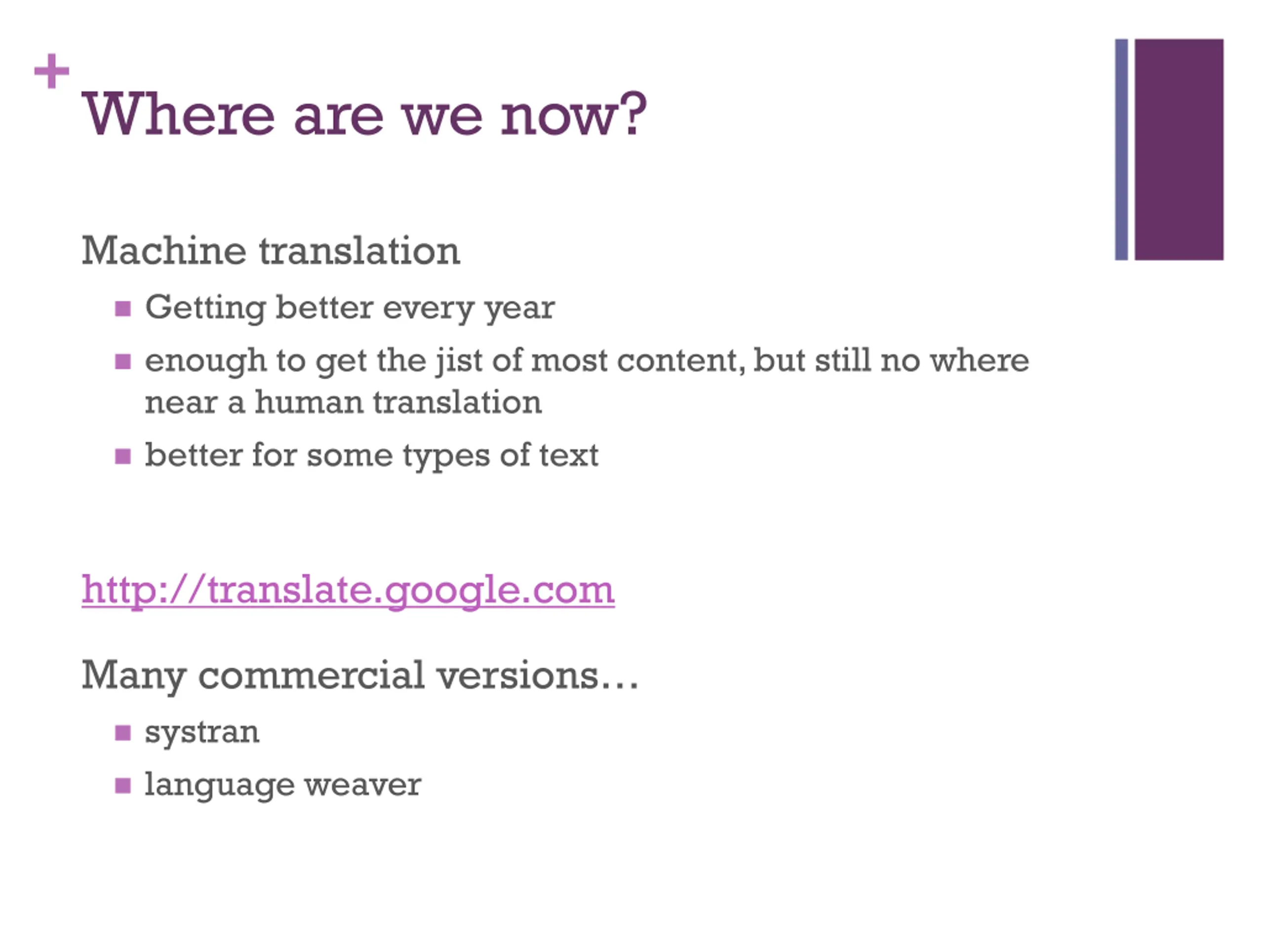+Where are we now? Machine translation Getting better every year enough to get the jist of most content, but still no where near a human translation better for some types of text http://translate.google.com Many commercial versions systran language weaver