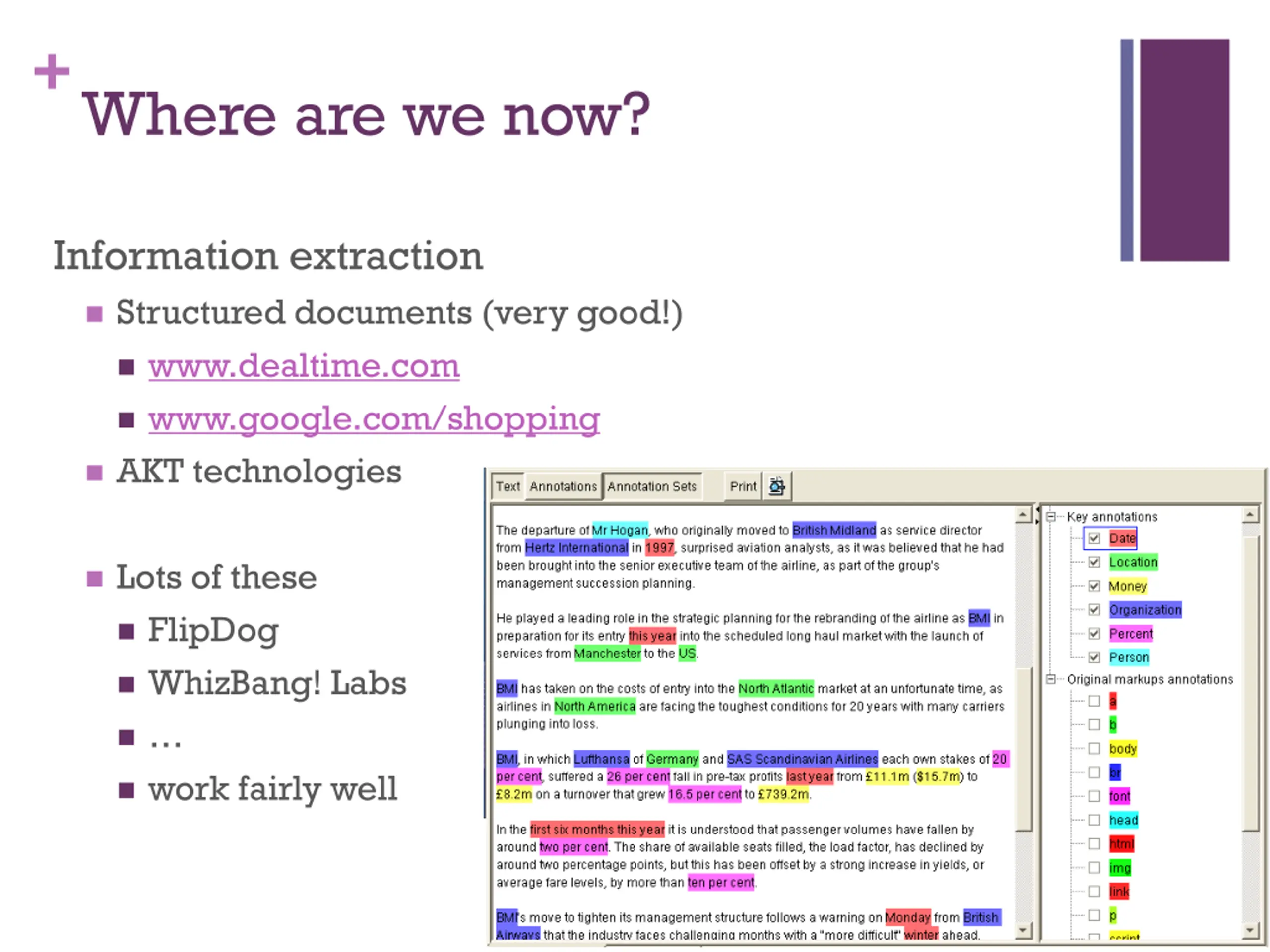 +Where are we now? Information extraction Structured documents (very good!) www.dealtime.com www.google.com/shopping AKT technologies Lots of these FlipDog WhizBang! Labs work fairly well