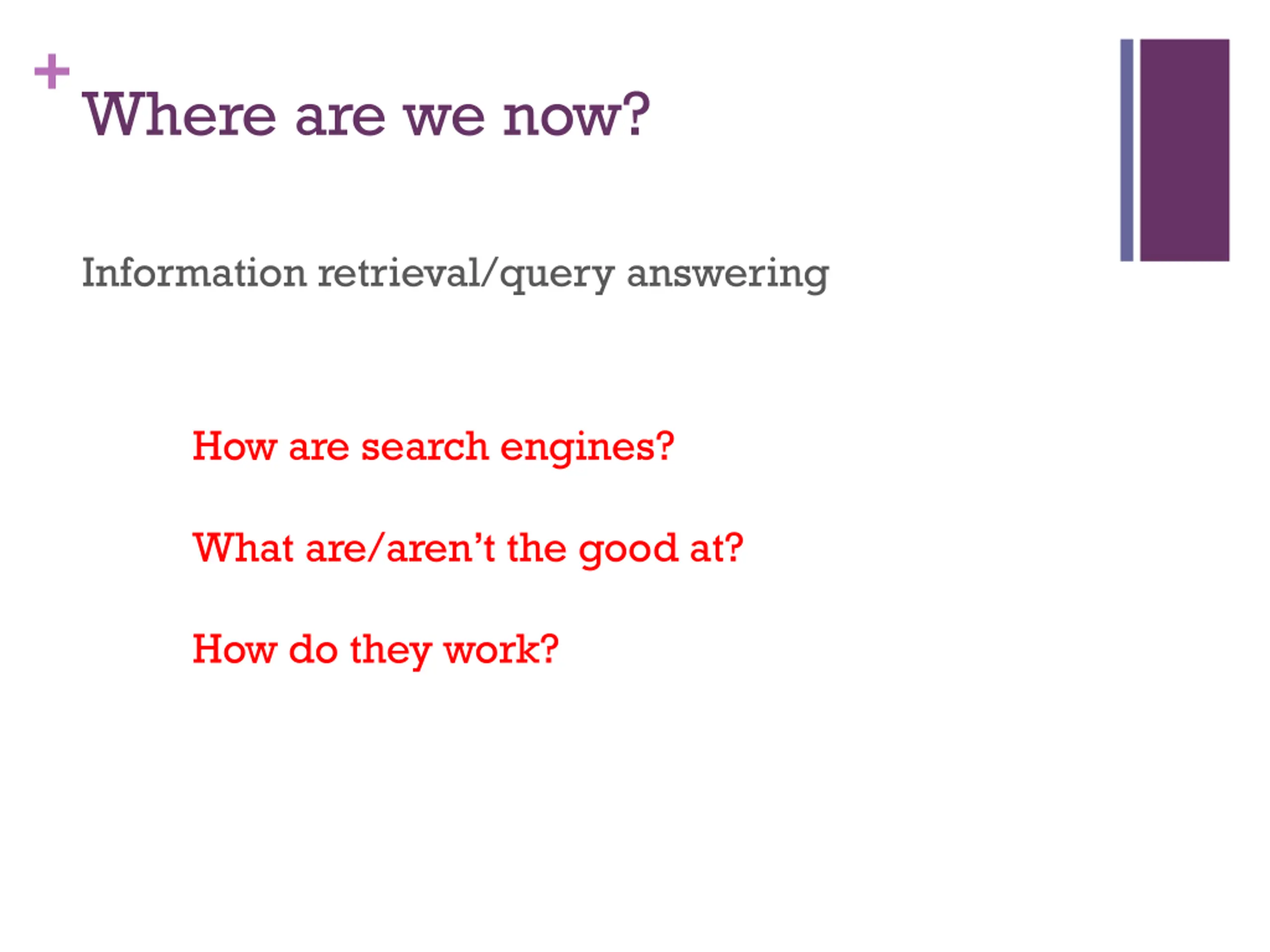 +Where are we now? Information retrieval/query answering How are search engines? What are/aren t the good at? How do they work?